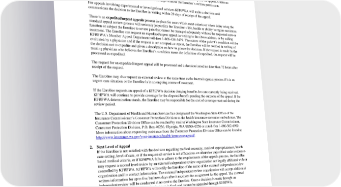 the Enrollee of its receipt of the request within 72 hours of receiving it. Appeals should be directed to KFHPWA’s Member Appeal Department, P.O. Box 34593, Seattle, WA 98124-1593, toll-free 1-866-458-5479. A party not involved in the initial coverage determination and not a subordinate of the party making the initial coverage determination will review the appeal request. KFHPWA will then notify the Enrollee of its determination or need for an extension of time within 14 days of receiving the request for appeal. Under no circumstances will the review timeframe exceed 30 days without the Enrollee’s written permission. For appeals involving experimental or investigational services KFHPWA will make a decision and communicate the decision to the Enrollee in writing within 20 days of receipt of the appeal. There is an expedited/urgent appeals process in place for cases which meet criteria or where delay using the standard appeal review process will seriously jeopardize the Enrollee’s life, health or ability to regain maximum function or subject the Enrollee to severe pain that cannot be managed adequately without the requested care or treatment. The Enrollee can request an expedited/urgent appeal in writing to the above address, or by calling KFHPWA’s Member Appeal Department toll-free 1-866-458-5479. The nature of the patient’s condition will be evaluated by a physician and if the request is not accepted as urgent, the Enrollee will be notified in writing of the decision not to expedite and given a description on how to grieve the decision. If the request is made by the treating physician who believes the Enrollee’s condition meets the definition of expedited, the request will be processed as expedited. The request for an expedited/urgent appeal will be processed and a decision issued no later than 72 hours after receipt of the request. The Enrollee may also request an external review at the same time as the internal appeals process if it is an urgent care situation or the Enrollee is in an ongoing course of treatment. If the Enrollee requests an appeal of a KFHPWA decision denying benefits for care currently being received, KFHPWA will continue to provide coverage for the disputed benefit pending the outcome of the appeal. If the KFHPWA determination stands, the Enrollee may be responsible for the cost of coverage received during the review period. The U.S. Department of Health and Human Services has designated the Washington State Office of the Insurance Commissioner’s Consumer Protection Division as the health insurance consumer ombudsman. The Consumer Protection Division Office can be reached by mail at Washington State Insurance Commissioner, Consumer Protection Division, P.O. Box 40256, Olympia, WA 98504-0256 or at toll-free 1-800-562-6900. More information about requesting assistance from the Consumer Protection Division Office can be found at http://www.insurance.wa.gov/your-insurance/health-insurance/appeal/. 2. Next Level of Appeal If the Enrollee is not satisfied with the decision regarding medical necessity, medical appropriateness, health care setting, level of care, or if the requested service is not efficacious or otherwise unjustified under evidence- based medical criteria, or if KFHPWA fails to adhere to the requirements of the appeals process, the Enrollee may request a second level review by an external independent review organization not legally affiliated with or controlled by KFHPWA. KFHPWA will notify the Enrollee of the name of the external independent review organization and its contact information. The external independent review organization will accept additional written information for up to five business days after it receives the assignment for the appeal. The external independent review will be conducted at no cost to the Enrollee. Once a decision is made through an independent review organization, the decision is final and cannot be appealed through KFHPWA. If the Enrollee requests an appeal of a KFHPWA decision denying benefits for care currently being received, KFHPWA will continue to provide coverage for the disputed benefit pending the outcome of the appeal. If the KFHPWA determination stands, the Enrollee may be responsible for the cost of coverage received during the review period. PEBB_SCA_2024 64
