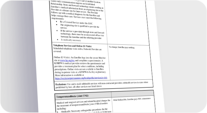 Telehealth Services Telemedicine Enrollee pays $10 Copayment Services provided by the use of real time interactive audio and video communications between the patient at the originating site and a Network provider at another location. Audio-only communication requires an Established Relationship. Store and forward technology means sending an Enrollee’s medical information from an originating site to the Provider at a distant site for later review. The Provider follows up with a medical diagnosis for the Enrollee and helps manage their care. Services must meet the following requirements: • Be a Covered Service under this EOC. • The originating site is qualified to provide the service. • If the service is provided through store and forward technology, there must be an associated office visit between the Enrollee and the referring provider • Is medically necessary Telephone Services and Online (E-Visits) No charge; Enrollee pays nothing Scheduled telephone visits with a Network Provider are covered. Online (E-Visits): An Enrollee logs into the secure Member site at www.kp.org/wa and completes a questionnaire. A KFHPWA medical provider reviews the questionnaire and provides a treatment plan for select conditions, including prescriptions. Online visits are not available to Enrollees during in-person visits at a KFHPWA facility or pharmacy. More information is available at https://wa.kaiserpermanente.org/html/public/services/e-visit. Exclusions: Fax and e-mail; telehealth services with non-contracted providers; telehealth services in states where prohibited by law; all other services not listed above Temporomandibular Joint (TMJ) Medical and surgical services and related hospital charges for After Deductible, Enrollee pays 50% coinsurance the treatment of temporomandibular joint (TMJ) disorders including: • Medically Necessary orthognathic procedures for the treatment of severe TMJ disorders which have failed non- surgical intervention. • Radiology services. • TMJ specialist services. • Fitting/adjustment of splints. Non-Emergency inpatient hospital services require PEBB_SCA_2024 44