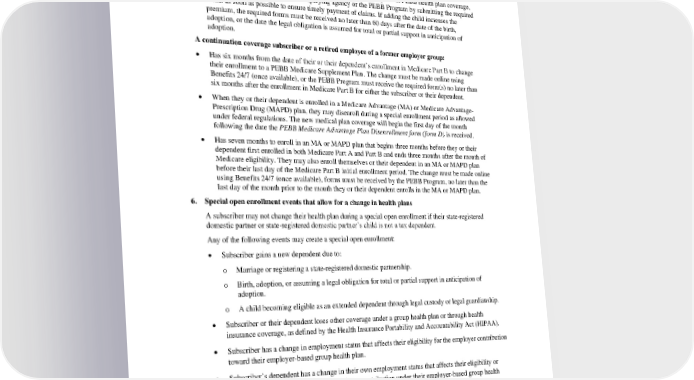 require the subscriber to provide proof of a dependent’s eligibility, evidence of the event that created the special open enrollment, or both. Exceptions: • If a subscriber wants to enroll a newborn or child whom the subscriber has adopted or has assumed a legal obligation for total or partial support in anticipation of adoption in PEBB health plan coverage, the subscriber should notify their employing agency or the PEBB Program by submitting the required forms as soon as possible to ensure timely payment of claims. If adding the child increases the premium, the required forms must be received no later than 60 days after the date of the birth, adoption, or the date the legal obligation is assumed for total or partial support in anticipation of adoption. A continuation coverage subscriber or a retired employee of a former employer group: • Has six months from the date of their or their dependent’s enrollment in Medicare Part B to change their enrollment to a PEBB Medicare Supplement Plan. The change must be made online using Benefits 24/7 (once available), or the PEBB Program must receive the required form(s) no later than six months after the enrollment in Medicare Part B for either the subscriber or their dependent. • When they or their dependent is enrolled in a Medicare Advantage (MA) or Medicare Advantage- Prescription Drug (MAPD) plan, they may disenroll during a special enrollment period as allowed under federal regulations. The new medical plan coverage will begin the first day of the month following the date the PEBB Medicare Advantage Plan Disenrollment form (form D) is received. • Has seven months to enroll in an MA or MAPD plan that begins three months before they or their dependent first enrolled in both Medicare Part A and Part B and ends three months after the month of Medicare eligibility. They may also enroll themselves or their dependent in an MA or MAPD plan before their last day of the Medicare Part B initial enrollment period. The change must be made online using Benefits 24/7 (once available), forms must be received by the PEBB Program, no later than the last day of the month prior to the month they or their dependent enrolls in the MA or MAPD plan. 6. Special open enrollment events that allow for a change in health plans A subscriber may not change their health plan during a special open enrollment if their state-registered domestic partner or state-registered domestic partner’s child is not a tax dependent. Any of the following events may create a special open enrollment: • Subscriber gains a new dependent due to: o Marriage or registering a state-registered domestic partnership. o Birth, adoption, or assuming a legal obligation for total or partial support in anticipation of adoption. o A child becoming eligible as an extended dependent through legal custody or legal guardianship. • Subscriber or their dependent loses other coverage under a group health plan or through health insurance coverage, as defined by the Health Insurance Portability and Accountability Act (HIPAA). • Subscriber has a change in employment status that affects their eligibility for the employer contribution toward their employer-based group health plan. • Subscriber’s dependent has a change in their own employment status that affects their eligibility or their dependent’s eligibility for the employer contribution under their employer-based group health plan. “Employer contribution” means contributions made by the dependent’s current or former employer toward health coverage as described in the Treasury Regulation. • Subscriber or their dependent has a change in residence that affects health plan availability. If the subscriber has a change in residence and their current medical plan is no longer available, the subscriber must select a new medical plan as described in PEBB Program rules. If the subscriber does PEBB_SCA_2024 56