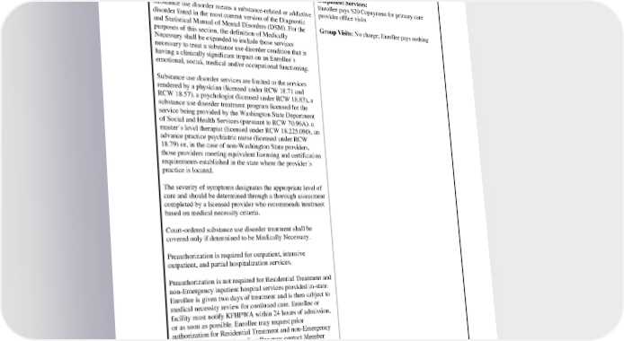 Substance Use Disorder Substance use disorder services including inpatient Hospital - Inpatient: After Deductible, Enrollee Residential Treatment; diagnostic evaluation and education; pays $500 Copayment per admission organized individual and group counseling; and/or prescription drugs unless excluded under Sections IV. or V. Outpatient Services: Enrollee pays $20 Copayment for primary care Substance use disorder means a substance-related or addictive provider office visits disorder listed in the most current version of the Diagnostic and Statistical Manual of Mental Disorders (DSM). For the Group Visits: No charge; Enrollee pays nothing purposes of this section, the definition of Medically Necessary shall be expanded to include those services necessary to treat a substance use disorder condition that is having a clinically significant impact on an Enrollee’s emotional, social, medical and/or occupational functioning. Substance use disorder services are limited to the services rendered by a physician (licensed under RCW 18.71 and RCW 18.57), a psychologist (licensed under RCW 18.83), a substance use disorder treatment program licensed for the service being provided by the Washington State Department of Social and Health Services (pursuant to RCW 70.96A), a master’s level therapist (licensed under RCW 18.225.090), an advance practice psychiatric nurse (licensed under RCW 18.79) or, in the case of non-Washington State providers, those providers meeting equivalent licensing and certification requirements established in the state where the provider’s practice is located. The severity of symptoms designates the appropriate level of care and should be determined through a thorough assessment completed by a licensed provider who recommends treatment based on medical necessity criteria. Court-ordered substance use disorder treatment shall be covered only if determined to be Medically Necessary. Preauthorization is required for outpatient, intensive outpatient, and partial hospitalization services. Preauthorization is not required for Residential Treatment and non-Emergency inpatient hospital services provided in-state. Enrollee is given two days of treatment and is then subject to medical necessity review for continued care. Enrollee or facility must notify KFHPWA within 24 hours of admission, or as soon as possible. Enrollee may request prior authorization for Residential Treatment and non-Emergency inpatient hospital services. Enrollee may contact Member Services to request Preauthorization. Withdrawal Management Services for Alcoholism and Emergency Services Network Facility: After Substance Use Disorder. Deductible, Enrollee pays $75 Copayment and 15% Plan Coinsurance Withdrawal management services means the management of symptoms and complications of alcohol and/or substance Emergency Services Non-Network Facility: After PEBB_SCA_2024 42