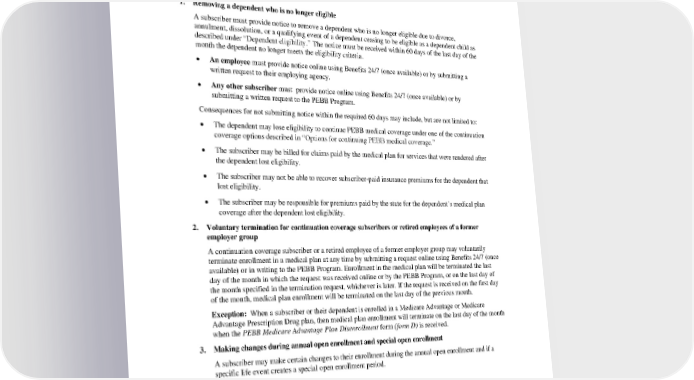• For a spouse or state registered domestic partner of a subscriber, medical coverage will begin the first day of the month in which the event occurs. If the special open enrollment is due to the enrollment of an extended dependent, or a dependent child with a disability, medical coverage will begin on the first day of the month following the event date or eligibility certification, whichever is later. E. Making changes 1. Removing a dependent who is no longer eligible A subscriber must provide notice to remove a dependent who is no longer eligible due to divorce, annulment, dissolution, or a qualifying event of a dependent ceasing to be eligible as a dependent child as described under “Dependent eligibility.” The notice must be received within 60 days of the last day of the month the dependent no longer meets the eligibility criteria. • An employee must provide notice online using Benefits 24/7 (once available) or by submitting a written request to their employing agency. • Any other subscriber must provide notice online using Benefits 24/7 (once available) or by submitting a written request to the PEBB Program. Consequences for not submitting notice within the required 60 days may include, but are not limited to: • The dependent may lose eligibility to continue PEBB medical coverage under one of the continuation coverage options described in “Options for continuing PEBB medical coverage.” • The subscriber may be billed for claims paid by the medical plan for services that were rendered after the dependent lost eligibility. • The subscriber may not be able to recover subscriber-paid insurance premiums for the dependent that lost eligibility. • The subscriber may be responsible for premiums paid by the state for the dependent’s medical plan coverage after the dependent lost eligibility. 2. Voluntary termination for continuation coverage subscribers or retired employees of a former employer group A continuation coverage subscriber or a retired employee of a former employer group may voluntarily terminate enrollment in a medical plan at any time by submitting a request online using Benefits 24/7 (once available) or in writing to the PEBB Program. Enrollment in the medical plan will be terminated the last day of the month in which the request was received online or by the PEBB Program, or on the last day of the month specified in the termination request, whichever is later. If the request is received on the first day of the month, medical plan enrollment will be terminated on the last day of the previous month. Exception: When a subscriber or their dependent is enrolled in a Medicare Advantage or Medicare Advantage Prescription Drug plan, then medical plan enrollment will terminate on the last day of the month when the PEBB Medicare Advantage Plan Disenrollment form (form D) is received. 3. Making changes during annual open enrollment and special open enrollment A subscriber may make certain changes to their enrollment during the annual open enrollment and if a specific life event creates a special open enrollment period. 4. Annual Open Enrollment changes. An employee may make the following changes to their enrollment during the PEBB Program’s annual open enrollment period: • Change their medical plan • Waive their medical plan enrollment PEBB_SCA_2024 54