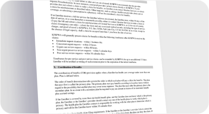 A request for a review by an independent review organization must be made within 180 days after the date of the initial appeal decision notice. IX. Claims Claims for benefits may be made before or after services are obtained. KFHPWA recommends that the provider requests Preauthorization. In most instances, contracted providers submit claims directly to KFHPWA. If your provider does not submit a claim to make a claim for benefits, an Enrollee must contact Member Services, or submit a claim for reimbursement as described below. Other inquiries, such as asking a health care provider about care or coverage, or submitting a prescription to a pharmacy, will not be considered a claim for benefits. If an Enrollee receives a bill for services the Enrollee believes are covered, the Enrollee must, within 90 days of the date of service, or as soon thereafter as reasonably possible, either (1) contact Member Services to make a claim or (2) pay the bill and submit a claim for reimbursement of Covered Services to KFHPWA, or (3) for out-of-country claims (Emergency care only) – submit the claim and any associated medical records, including the type of service, charges, and proof of travel to KFHPWA, P.O. Box 30766, Salt Lake City, UT 84130-0766. In no event, except in the absence of legal capacity, shall a claim be accepted later than 1 year from the date of service. KFHPWA will generally process claims for benefits within the following timeframes after KFHPWA receives the claims: • Immediate request situations – within 1 business day. • Concurrent urgent requests – within 24 hours. • Urgent care review requests – within 48 hours. • Non-urgent preservice review requests – within 5 calendar days. • Post-service review requests – within 30 calendar days. Timeframes for pre-service and post-service claims can be extended by KFHPWA for up to an additional 15 days. Enrollee will be notified in writing of such extension prior to the expiration of the initial timeframe. X. Coordination of Benefits The coordination of benefits (COB) provision applies when a Enrollee has health care coverage under more than one plan. Plan is defined below. The order of benefit determination rules govern the order in which each plan will pay a claim for benefits. The plan that pays first is called the primary plan. The primary plan must pay benefits according to its policy terms without regard to the possibility that another plan may cover some expenses. The plan that pays after the primary plan is the secondary plan. In no event will a secondary plan be required to pay an amount in excess of its maximum benefit plus accrued savings. If the Enrollee is covered by more than one health benefit plan, and the Enrollee does not know which is the primary plan, the Enrollee or the Enrollee’s provider should contact any one of the health plans to verify which plan is primary. The health plan the Enrollee contacts is responsible for working with the other plan to determine which is primary and will let the Enrollee know within 30 calendar days. All health plans have timely claim filing requirements. If the Enrollee or the Enrollee’s provider fails to submit the Enrollee’s claim to a secondary health plan within that plan’s claim filing time limit, the plan can deny the claim. If the Enrollee experiences delays in the processing of the claim by the primary health plan, the Enrollee or the Enrollee’s provider will need to submit the claim to the secondary health plan within its claim filing time limit to prevent a denial of the claim. If the Enrollee is covered by more than one health benefit plan, the Enrollee or the Enrollee’s provider should file all the Enrollee’s claims with each plan at the same time. If Medicare is the Enrollee’s primary plan, Medicare may submit the Enrollee’s claims to the Enrollee’s secondary carrier. PEBB_SCA_2024 65