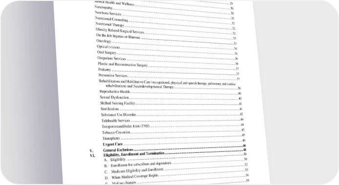 Infertility (including sterility) ........................................................................................................................ 28 Infusion Therapy ........................................................................................................................................... 28 Laboratory and Radiology ............................................................................................................................. 29 Manipulative Therapy ................................................................................................................................... 29 Massage Therapy ........................................................................................................................................... 29 Maternity and Pregnancy ............................................................................................................................... 30 Mental Health and Wellness .......................................................................................................................... 30 Naturopathy ................................................................................................................................................... 32 Newborn Services ......................................................................................................................................... 32 Nutritional Counseling .................................................................................................................................. 32 Nutritional Therapy ....................................................................................................................................... 32 Obesity Related Surgical Services................................................................................................................. 33 On the Job Injuries or Illnesses ..................................................................................................................... 33 Oncology ....................................................................................................................................................... 34 Optical (vision) .............................................................................................................................................. 34 Oral Surgery .................................................................................................................................................. 36 Outpatient Services ....................................................................................................................................... 36 Plastic and Reconstructive Surgery ............................................................................................................... 37 Podiatry ......................................................................................................................................................... 37 Preventive Services ....................................................................................................................................... 37 Rehabilitation and Habilitative Care (occupational, physical and speech therapy, pulmonary and cardiac rehabilitation) and Neurodevelopmental Therapy .................................................................................. 38 Reproductive Health ...................................................................................................................................... 40 Sexual Dysfunction ....................................................................................................................................... 40 Skilled Nursing Facility................................................................................................................................. 41 Sterilization ................................................................................................................................................... 41 Substance Use Disorder................................................................................................................................. 42 Telehealth Services ....................................................................................................................................... 44 Temporomandibular Joint (TMJ) .................................................................................................................. 44 Tobacco Cessation ......................................................................................................................................... 45 Transplants .................................................................................................................................................... 45 Urgent Care ................................................................................................................................................. 46 V. General Exclusions ...................................................................................................................................... 46 VI. Eligibility, Enrollment and Termination ................................................................................................... 48 A. Eligibility. .............................................................................................................................................. 48 B. Enrollment for subscribers and dependents. ........................................................................................... 50 C. Medicare Eligibility and Enrollment. ..................................................................................................... 52 D. When Medical Coverage Begins. ........................................................................................................... 53 E. Making changes .......................................................................................................