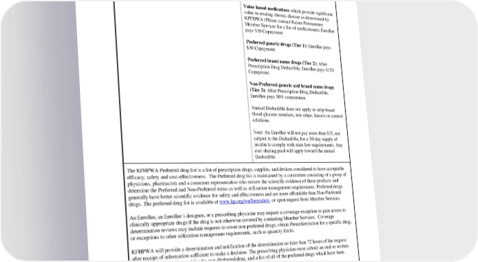 Over-the-counter drugs not included under Preventive Care or Not covered; Enrollee pays 100% of all charges Reproductive Health. Mail order drugs dispensed through the KFHPWA-designated Enrollee pays the prescription drug Cost Share for mail order service. each 90-day supply or less Value based medications which provide significant value in treating chronic disease as determined by KPFHWA (Please contact Kaiser Permanente Member Services for a list of medications): Enrollee pays $10 Copayment Preferred generic drugs (Tier 1): Enrollee pays $30 Copayment Preferred brand name drugs (Tier 2): After Prescription Drug Deductible, Enrollee pays $120 Copayment Non-Preferred generic and brand name drugs (Tier 3): After Prescription Drug Deductible, Enrollee pays 50% coinsurance Annual Deductible does not apply to strip-based blood glucose monitors, test strips, lancets or control solutions. Note: An Enrollee will not pay more than $35, not subject to the Deductible, for a 30-day supply of insulin to comply with state law requirements. Any cost sharing paid will apply toward the annual Deductible. The KFHPWA Preferred drug list is a list of prescription drugs, supplies, and devices considered to have acceptable efficacy, safety and cost-effectiveness. The Preferred drug list is maintained by a committee consisting of a group of physicians, pharmacists and a consumer representative who review the scientific evidence of these products and determine the Preferred and Non-Preferred status as well as utilization management requirements. Preferred drugs generally have better scientific evidence for safety and effectiveness and are more affordable than Non-Preferred drugs. The preferred drug list is available at www.kp.org/wa/formulary, or upon request from Member Services. An Enrollee, an Enrollee’s designee, or a prescribing physician may request a coverage exception to gain access to clinically appropriate drugs if the drug is not otherwise covered by contacting Member Services. Coverage determination reviews may include requests to cover non-preferred drugs, obtain Preauthorization for a specific drug, or exceptions to other utilization management requirements, such as quantity limits. KFHPWA will provide a determination and notification of the determination no later than 72 hours of the request after receipt of information sufficient to make a decision. The prescribing physician must submit an oral or written statement regarding the need for the non-Preferred drug, and a list of all of the preferred drugs which have been ineffective for the Enrollee. Expedited or Urgent Reviews: An Enrollee, an Enrollee’s designee, or a prescribing physician may request an expedited review for coverage for non-covered drugs when a delay caused by using the standard review process will seriously jeopardize the Enrollee’s life, health or ability to regain maximum function or will subject to the Enrollee to severe pain that cannot be managed adequately without the requested drug. KFHPWA or the IRO will provide a determination and notification of the determination no later than 24 hours from the receipt of the request after receipt PEBB_SCA_2024 22