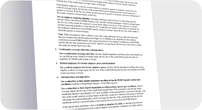 Medicare may be delayed. If enrollment in Medicare does not occur when the subscriber or their dependent is first eligible, a late enrollment penalty may apply. D. When Medical Coverage Begins. 1. Employees and dependents For a newly eligible employee and their eligible dependents, medical coverage begins the first day of the month following the date the employee becomes eligible. If the employee becomes eligible on the first working day of the month, then coverage begins on that date. If the eligible employee is a faculty member hired on a quarter-to-quarter or semester-to-semester basis, medical coverage begins the first day of the month following the beginning of the second consecutive quarter or semester. If the first day of the second consecutive quarter or semester is the first working day of the month, medical coverage begins on that day. For an employee regaining eligibility, including following a period of leave or after being between periods of leave described in PEBB Program rules, and their eligible dependents, medical coverage begins the first day of the month the employee is in pay status eight or mor hours. If the employee is a faculty member regaining eligibility no later than the 12th month after the month in which they lost eligibility for the employer contribution toward PEBB benefits, medical coverage begins the first day of the month in which the quarter or semester begins. Note: When an employee who is called to active duty in the uniformed services under the Uniformed Services Employment and Reemployment Rights Act (USERRA) loses eligibility for the employer contribution toward PEBB benefits, they regain eligibility for the employer contribution toward PEBB benefits the day they return from active duty. Medical coverage begins the first day of the month in which the employee returns from active duty. 2. Continuation coverage subscriber and dependents For a continuation coverage subscriber and their eligible dependents enrolling when newly eligible due to a qualifying event, medical coverage begins the first day of the month following the day they lost eligibility for PEBB medical plan coverage. 3. Retired employees of a former employer group and dependents For a retired employee of a former employer group and their eligible dependents enrolling when newly eligible, medical coverage begins the first day of the month following the day they lost eligibility for PEBB retiree insurance coverage. 4. All Subscribers and dependents For a subscriber or their eligible dependents enrolling during the PEBB Program’s annual open enrollment, medical coverage begins January 1 of the following year. For a subscriber or their eligible dependents enrolling during a special open enrollment, medical coverage begins the first day of the month following the later of the event date or the date the online enrollment election using Benefits 24/7 (once available) or the required form is received. If that day is the first of the month, medical coverage begins on that day, except for a Medicare Advantage or Medicare Advantage Prescription Drug plan, which will begin the first day of the month following the date the enrollment election is received online or the required form is received by the PEBB Program. If the special open enrollment is due to the birth or adoption of a child, or when the subscriber has assumed a legal obligation for total or partial support in anticipation of adoption of a child, medical coverage will begin as follows: • For an employee, medical coverage will begin the first day of the month in which the event occurs. • For a newly born child, medical coverage will begin the date of birth. • For a newly adopted child, medical coverage will begin on the date of placement or the date a legal obligation is assumed in anticipation of adoption, whichever is earlier. PEBB_SCA_2024 53