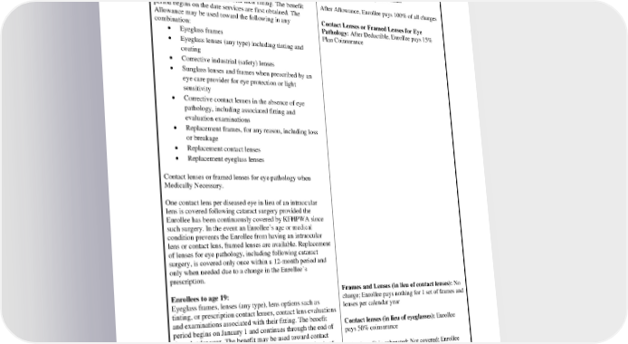 monitor Medical Conditions, as often as Medically care provider office visits Necessary. Enrollees age 19 and over: No charge; Enrollee pays nothing limited to an Eyeglass frames, lenses (any type), lens options such as Allowance of $150 every 24 months tinting, or prescription contact lenses, contact lens evaluations and examinations associated with their fitting. The benefit After Allowance, Enrollee pays 100% of all charges period begins on the date services are first obtained. The Allowance may be used toward the following in any Contact Lenses or Framed Lenses for Eye combination: Pathology: After Deductible, Enrollee pays 15% • Eyeglass frames Plan Coinsurance • Eyeglass lenses (any type) including tinting and coating • Corrective industrial (safety) lenses • Sunglass lenses and frames when prescribed by an eye care provider for eye protection or light sensitivity • Corrective contact lenses in the absence of eye pathology, including associated fitting and evaluation examinations • Replacement frames, for any reason, including loss or breakage • Replacement contact lenses • Replacement eyeglass lenses Contact lenses or framed lenses for eye pathology when Medically Necessary. One contact lens per diseased eye in lieu of an intraocular lens is covered following cataract surgery provided the Enrollee has been continuously covered by KFHPWA since such surgery. In the event an Enrollee’s age or medical condition prevents the Enrollee from having an intraocular lens or contact lens, framed lenses are available. Replacement of lenses for eye pathology, including following cataract surgery, is covered only once within a 12-month period and only when needed due to a change in the Enrollee’s prescription. Enrollees to age 19: Frames and Lenses (in lieu of contact lenses): No Eyeglass frames, lenses (any type), lens options such as charge; Enrollee pays nothing for 1 set of frames and tinting, or prescription contact lenses, contact lens evaluations lenses per calendar year and examinations associated with their fitting. The benefit period begins on January 1 and continues through the end of Contact lenses (in lieu of eyeglasses): Enrollee the calendar year. The benefit may be used toward contact pays 50% coinsurance lenses (in lieu of eyeglasses) or 1 eyeglass frame and pair of lenses. After benefit is exhausted: Not covered; Enrollee • Eyeglass frames pays 100% of all charges • Eyeglass lenses (any type) including tinting and coating Contact Lenses or Framed Lenses for Eye • Corrective industrial (safety) lenses Pathology: After Deductible, Enrollee pays 15% • Corrective contact lenses in the absence of eye Plan Coinsurance PEBB_SCA_2024 35