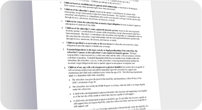 2. State-registered domestic partner and substantially equivalent legal unions from jurisdictions as defined in Washington State statute. Individuals in a state-registered domestic partnership are treated the same as a legal spouse except when in conflict with federal law. 3. Children. Children are eligible through the last day of the month in which their 26th birthday occurred regardless of marital status, student status, or eligibility for coverage under another plan. It also includes children age 26 or older with a disability as described below in “Children of any age with a developmental or physical disability.”. Children are defined as the subscriber’s: a. Children based on establishment of a parent-child relationship, as described in Washington State statutes, except when parental rights have been terminated; b. Children of the subscriber’s spouse, based on the spouse’s establishment of a parent-child relationship, except when parental rights have been terminated. The stepchild’s relationship to the subscriber (and eligibility as a dependent) ends on the same date the marriage with the spouse ends through divorce, annulment, dissolution, termination, or death; c. Children for whom the subscriber has assumed a legal obligation for total or partial support in anticipation of adoption of the child; d. Children of the subscriber’s state-registered domestic partner, based on the state-registered domestic partner’s establishment of a parent-child relationship, except when parental rights have been terminated. The child’s relationship to the subscriber (and eligibility as a dependent) ends on the same date the subscriber’s legal relationship with the state-registered domestic partner ends through divorce, annulment, dissolution, termination, or death; e. Children specified in a court order or divorce decree for whom the subscriber has a legal obligation to provide support or health care coverage; f. Extended dependents in the legal custody or legal guardianship of the subscriber, the subscriber’s spouse, or the subscriber’s state-registered domestic partner. The legal responsibility is demonstrated by a valid court order and the child’s official residence with the custodian or guardian. Extended dependent child does not include foster children unless the subscriber, the subscriber’s spouse, or the subscriber’s state-registered domestic partner has assumed a legal obligation for total or partial support in anticipation of adoption; and g. Children of any age with a developmental or physical disability that renders them incapable of self-sustaining employment and chiefly dependent upon the subscriber for support and maintenance provided such condition occurs before the age of 26. The following requirements apply to a dependent child with a disability: The subscriber must provide proof of the disability and dependency within 60 days of the • child’s attainment of age 26; The subscriber must notify the PEBB Program in writing, when the child is no longer eligible • under this subsection; A child with a developmental or physical disability who becomes self-supporting is not eligible • as of the last day of the month in which they become capable of self-support; A child with a developmental or physical disability age 26 and older who becomes capable of • self-support does not regain eligibility under this subsection if they later become incapable of self-support; and The PEBB Program with input from the medical plan will periodically verify the eligibility of a • dependent child with a disability beginning at age 26, but no more frequently than annually after the two-year period following the child’s 26th birthday. Verification will require renewed proof of disability and dependence from the subscriber. PEBB_SCA_2024 49