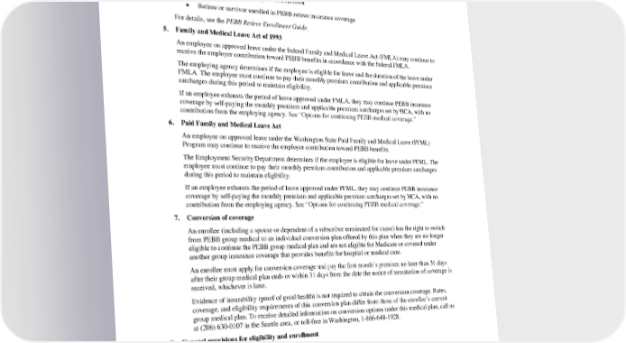 • Retiring employee • Retiring school employee • Eligible elected or full-time appointed official of the legislative or executive branch of state government leaving public office • Dependent becoming eligible as a survivor • Retiree or survivor enrolled in PEBB retiree insurance coverage For details, see the PEBB Retiree Enrollment Guide. 5. Family and Medical Leave Act of 1993 An employee on approved leave under the federal Family and Medical Leave Act (FMLA) may continue to receive the employer contribution toward PEBB benefits in accordance with the federal FMLA. The employing agency determines if the employee is eligible for leave and the duration of the leave under FMLA. The employee must continue to pay their monthly premium contribution and applicable premium surcharges during this period to maintain eligibility. If an employee exhausts the period of leave approved under FMLA, they may continue PEBB insurance coverage by self-paying the monthly premium and applicable premium surcharges set by HCA, with no contribution from the employing agency. See “Options for continuing PEBB medical coverage.” 6. Paid Family and Medical Leave Act An employee on approved leave under the Washington State Paid Family and Medical Leave (PFML) Program may continue to receive the employer contribution toward PEBB benefits. The Employment Security Department determines if the employee is eligible for leave under PFML. The employee must continue to pay their monthly premium contribution and applicable premium surcharges during this period to maintain eligibility. If an employee exhausts the period of leave approved under PFML, they may continue PEBB insurance coverage by self-paying the monthly premium and applicable premium surcharges set by HCA, with no contribution from the employing agency. See “Options for continuing PEBB medical coverage.” 7. Conversion of coverage An enrollee (including a spouse or dependent of a subscriber terminated for cause) has the right to switch from PEBB group medical to an individual conversion plan offered by this plan when they are no longer eligible to continue the PEBB group medical plan and are not eligible for Medicare or covered under another group insurance coverage that provides benefits for hospital or medical care. An enrollee must apply for conversion coverage and pay the first month’s premium no later than 31 days after their group medical plan ends or within 31 days from the date the notice of termination of coverage is received, whichever is later. Evidence of insurability (proof of good health) is not required to obtain the conversion coverage. Rates, coverage, and eligibility requirements of this conversion plan differ from those of the enrollee’s current group medical plan. To receive detailed information on conversion options under this medical plan, call us at (206) 630-0107 in the Seattle area, or toll-free in Washington, 1-866-648-1928. G. General provisions for eligibility and enrollment 1. Payment of premiums during a labor dispute Any employee or dependent whose monthly premiums are paid in full or in part by the employing agency may pay premiums directly to HCA if the employee’s compensation is suspended or terminated directly or indirectly because of a strike, lockout, or any other labor dispute, for a period not to exceed six months. PEBB_VA_2024 61