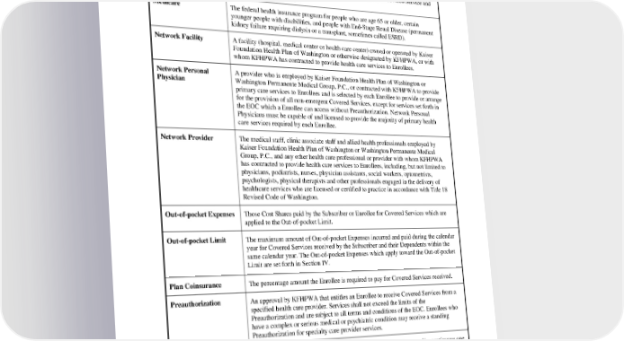 condition or quality of health services rendered; (g) are not primarily for research and data accumulation; and (h) are not experimental or investigational. The length and type of the treatment program and the frequency and modality of visits covered shall be determined by KFHPWA’s medical director. In addition to being medically necessary, to be covered, services and supplies must be otherwise included as a Covered Service and not excluded from coverage. Medicare The federal health insurance program for people who are age 65 or older, certain younger people with disabilities, and people with End-Stage Renal Disease (permanent kidney failure requiring dialysis or a transplant, sometimes called ESRD). Network Facility A facility (hospital, medical center or health care center) owned or operated by Kaiser Foundation Health Plan of Washington or otherwise designated by KFHPWA, or with whom KFHPWA has contracted to provide health care services to Enrollees. Network Personal A provider who is employed by Kaiser Foundation Health Plan of Washington or Physician Washington Permanente Medical Group, P.C., or contracted with KFHPWA to provide primary care services to Enrollees and is selected by each Enrollee to provide or arrange for the provision of all non-emergent Covered Services, except for services set forth in the EOC which a Enrollee can access without Preauthorization. Network Personal Physicians must be capable of and licensed to provide the majority of primary health care services required by each Enrollee. Network Provider The medical staff, clinic associate staff and allied health professionals employed by Kaiser Foundation Health Plan of Washington or Washington Permanente Medical Group, P.C., and any other health care professional or provider with whom KFHPWA has contracted to provide health care services to Enrollees, including, but not limited to physicians, podiatrists, nurses, physician assistants, social workers, optometrists, psychologists, physical therapists and other professionals engaged in the delivery of healthcare services who are licensed or certified to practice in accordance with Title 18 Revised Code of Washington. Out-of-pocket Expenses Those Cost Shares paid by the Subscriber or Enrollee for Covered Services which are applied to the Out-of-pocket Limit. Out-of-pocket Limit The maximum amount of Out-of-pocket Expenses incurred and paid during the calendar year for Covered Services received by the Subscriber and their Dependents within the same calendar year. The Out-of-pocket Expenses which apply toward the Out-of-pocket Limit are set forth in Section IV. Plan Coinsurance The percentage amount the Enrollee is required to pay for Covered Services received. Preauthorization An approval by KFHPWA that entitles an Enrollee to receive Covered Services from a specified health care provider. Services shall not exceed the limits of the Preauthorization and are subject to all terms and conditions of the EOC. Enrollees who have a complex or serious medical or psychiatric condition may receive a standing Preauthorization for specialty care provider services. Private Duty Nursing The hiring of a nurse by a family or Member to provide long term and/or continuous one (or 24-hour nursing on one care with or without oversight by a home health agency. The care may be skilled, care) supportive or respite in nature. Public Employees A group of representatives, appointed by the governor, who approves insurance benefit Benefits Board (PEBB) plans for employees and their dependents, and establishes eligibility criteria for PEBB_VA_2024 73