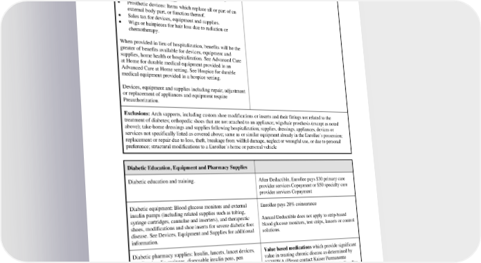 or assisting in restoration or improvement of its function. • Ostomy supplies: Supplies for the removal of bodily secretions or waste through an artificial opening. • Post-mastectomy bras/forms, limited to 2 every 6 months. Replacements within this 6-month period are covered when Medically Necessary due to a change in the Enrollee’s condition. • Prosthetic devices: Items which replace all or part of an external body part, or function thereof. • Sales tax for devices, equipment and supplies. • Wigs or hairpieces for hair loss due to radiation or chemotherapy. When provided in lieu of hospitalization, benefits will be the greater of benefits available for devices, equipment and supplies, home health or hospitalization. See Advanced Care at Home for durable medical equipment provided in an Advanced Care at Home setting. See Hospice for durable medical equipment provided in a hospice setting. Devices, equipment and supplies including repair, adjustment or replacement of appliances and equipment require Preauthorization. Exclusions: Arch supports, including custom shoe modifications or inserts and their fittings not related to the treatment of diabetes; orthopedic shoes that are not attached to an appliance; wigs/hair prosthesis (except as noted above); take-home dressings and supplies following hospitalization; supplies, dressings, appliances, devices or services not specifically listed as covered above; same as or similar equipment already in the Enrollee’s possession; replacement or repair due to loss, theft, breakage from willful damage, neglect or wrongful use, or due to personal preference; structural modifications to a Enrollee’s home or personal vehicle Diabetic Education, Equipment and Pharmacy Supplies Diabetic education and training. After Deductible, Enrollee pays $30 primary care provider services Copayment or $50 specialty care provider services Copayment Diabetic equipment: Blood glucose monitors and external Enrollee pays 20% coinsurance insulin pumps (including related supplies such as tubing, syringe cartridges, cannulae and inserters), and therapeutic Annual Deductible does not apply to strip-based shoes, modifications and shoe inserts for severe diabetic foot blood glucose monitors, test strips, lancets or control disease. See Devices, Equipment and Supplies for additional solutions. information. Diabetic pharmacy supplies: Insulin, lancets, lancet devices, Value based medications which provide significant needles, insulin syringes, disposable insulin pens, pen value in treating chronic disease as determined by needles, glucagon emergency kits, prescriptive oral agents KFHPWA (Please contact Kaiser Permanente and blood glucose test strips for a supply of 30 days or less Member Services for a list of medications): Enrollee per item. Certain brand name insulin drugs will be covered at pays $5 Copayment the generic level. See Drugs – Outpatient Prescription for additional pharmacy information. Preferred generic drugs (Tier 1): Enrollee pays $25 Copayment per 30-days up to a 90-day supply PEBB_VA_2024 18