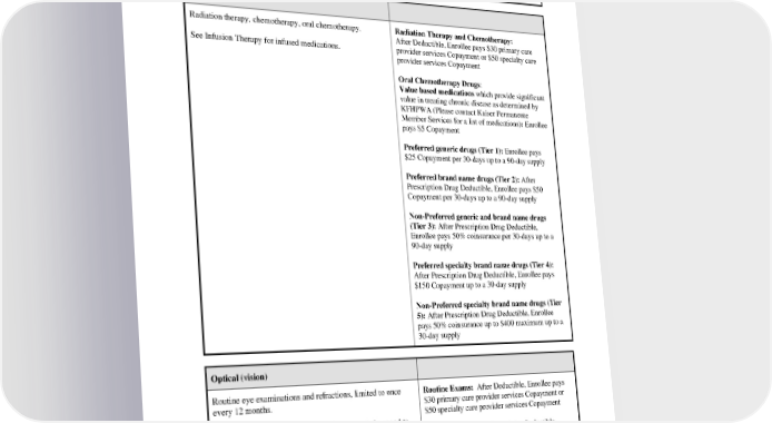 Services needed because of a workplace-related illness or injury that the Office of Workers’ Compensation Programs (OWCP) or a similar Federal or State agency determines they must provide; or OWCP or a similar agency pays through a third party injury settlement or other similar proceeding that is based on a claim you filed under OWCP or similar laws Oncology Radiation therapy, chemotherapy, oral chemotherapy. Radiation Therapy and Chemotherapy: After Deductible, Enrollee pays $30 primary care See Infusion Therapy for infused medications. provider services Copayment or $50 specialty care provider services Copayment Oral Chemotherapy Drugs: Value based medications which provide significant value in treating chronic disease as determined by KFHPWA (Please contact Kaiser Permanente Member Services for a list of medications): Enrollee pays $5 Copayment Preferred generic drugs (Tier 1): Enrollee pays $25 Copayment per 30-days up to a 90-day supply Preferred brand name drugs (Tier 2): After Prescription Drug Deductible, Enrollee pays $50 Copayment per 30-days up to a 90-day supply Non-Preferred generic and brand name drugs (Tier 3): After Prescription Drug Deductible, Enrollee pays 50% coinsurance per 30-days up to a 90-day supply Preferred specialty brand name drugs (Tier 4): After Prescription Drug Deductible, Enrollee pays $150 Copayment up to a 30-day supply Non-Preferred specialty brand name drugs (Tier 5): After Prescription Drug Deductible, Enrollee pays 50% coinsurance up to $400 maximum up to a 30-day supply Optical (vision) Routine eye examinations and refractions, limited to once Routine Exams: After Deductible, Enrollee pays every 12 months. $30 primary care provider services Copayment or $50 specialty care provider services Copayment Eye and contact lens examinations for eye pathology and to monitor Medical Conditions, as often as Medically Exams for Eye Pathology: After Deductible, Necessary. Enrollee pays $30 primary care provider services Copayment or $50 specialty care provider services Copayment PEBB_VA_2024 34