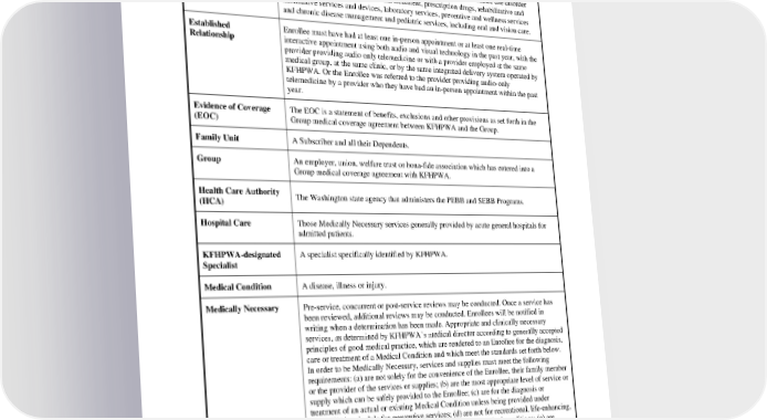 Enrollee Any enrolled Subscriber or Dependent. Essential Health Benefits set forth under the Patient Protection and Affordable Care Act of 2010, Benefits including the categories of ambulatory patient services, Emergency services, hospitalization, maternity and newborn care, mental health and substance use disorder services, including behavioral health treatment, prescription drugs, rehabilitative and habilitative services and devices, laboratory services, preventive and wellness services and chronic disease management and pediatric services, including oral and vision care. Established Enrollee must have had at least one in-person appointment or at least one real-time Relationship interactive appointment using both audio and visual technology in the past year, with the provider providing audio only telemedicine or with a provider employed at the same medical group, at the same clinic, or by the same integrated delivery system operated by KFHPWA. Or the Enrollee was referred to the provider providing audio-only telemedicine by a provider who they have had an in-person appointment within the past year. Evidence of Coverage The EOC is a statement of benefits, exclusions and other provisions as set forth in the (EOC) Group medical coverage agreement between KFHPWA and the Group. Family Unit A Subscriber and all their Dependents. Group An employer, union, welfare trust or bona-fide association which has entered into a Group medical coverage agreement with KFHPWA. Health Care Authority The Washington state agency that administers the PEBB and SEBB Programs. (HCA) Hospital Care Those Medically Necessary services generally provided by acute general hospitals for admitted patients. KFHPWA-designated A specialist specifically identified by KFHPWA. Specialist Medical Condition A disease, illness or injury. Medically Necessary Pre-service, concurrent or post-service reviews may be conducted. Once a service has been reviewed, additional reviews may be conducted. Enrollees will be notified in writing when a determination has been made. Appropriate and clinically necessary services, as determined by KFHPWA’s medical director according to generally accepted principles of good medical practice, which are rendered to an Enrollee for the diagnosis, care or treatment of a Medical Condition and which meet the standards set forth below. In order to be Medically Necessary, services and supplies must meet the following requirements: (a) are not solely for the convenience of the Enrollee, their family member or the provider of the services or supplies; (b) are the most appropriate level of service or supply which can be safely provided to the Enrollee; (c) are for the diagnosis or treatment of an actual or existing Medical Condition unless being provided under KFHPWA’s schedule for preventive services; (d) are not for recreational, life-enhancing, relaxation or palliative therapy, except for treatment of terminal conditions; (e) are appropriate and consistent with the diagnosis and which, in accordance with accepted medical standards in the State of Washington, could not have been omitted without adversely affecting the Enrollee’s condition or the quality of health services rendered; (f) as to inpatient care, could not have been provided in a provider’s office, the outpatient department of a hospital or a non-residential facility without affecting the Enrollee’s PEBB_VA_2024 72
