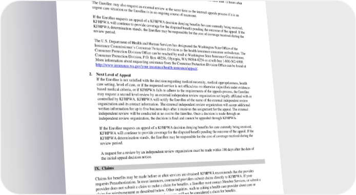 evaluated by a physician and if the request is not accepted as urgent, the Enrollee will be notified in writing of the decision not to expedite and given a description on how to grieve the decision. If the request is made by the treating physician who believes the Enrollee’s condition meets the definition of expedited, the request will be processed as expedited. The request for an expedited/urgent appeal will be processed and a decision issued no later than 72 hours after receipt of the request. The Enrollee may also request an external review at the same time as the internal appeals process if it is an urgent care situation or the Enrollee is in an ongoing course of treatment. If the Enrollee requests an appeal of a KFHPWA decision denying benefits for care currently being received, KFHPWA will continue to provide coverage for the disputed benefit pending the outcome of the appeal. If the KFHPWA determination stands, the Enrollee may be responsible for the cost of coverage received during the review period. The U.S. Department of Health and Human Services has designated the Washington State Office of the Insurance Commissioner’s Consumer Protection Division as the health insurance consumer ombudsman. The Consumer Protection Division Office can be reached by mail at Washington State Insurance Commissioner, Consumer Protection Division, P.O. Box 40256, Olympia, WA 98504-0256 or at toll-free 1-800-562-6900. More information about requesting assistance from the Consumer Protection Division Office can be found at http://www.insurance.wa.gov/your-insurance/health-insurance/appeal/. 2. Next Level of Appeal If the Enrollee is not satisfied with the decision regarding medical necessity, medical appropriateness, health care setting, level of care, or if the requested service is not efficacious or otherwise unjustified under evidence- based medical criteria, or if KFHPWA fails to adhere to the requirements of the appeals process, the Enrollee may request a second level review by an external independent review organization not legally affiliated with or controlled by KFHPWA. KFHPWA will notify the Enrollee of the name of the external independent review organization and its contact information. The external independent review organization will accept additional written information for up to five business days after it receives the assignment for the appeal. The external independent review will be conducted at no cost to the Enrollee. Once a decision is made through an independent review organization, the decision is final and cannot be appealed through KFHPWA. If the Enrollee requests an appeal of a KFHPWA decision denying benefits for care currently being received, KFHPWA will continue to provide coverage for the disputed benefit pending the outcome of the appeal. If the KFHPWA determination stands, the Enrollee may be responsible for the cost of coverage received during the review period. A request for a review by an independent review organization must be made within 180 days after the date of the initial appeal decision notice. IX. Claims Claims for benefits may be made before or after services are obtained. KFHPWA recommends that the provider requests Preauthorization. In most instances, contracted providers submit claims directly to KFHPWA. If your provider does not submit a claim to make a claim for benefits, a Enrollee must contact Member Services, or submit a claim for reimbursement as described below. Other inquiries, such as asking a health care provider about care or coverage, or submitting a prescription to a pharmacy, will not be considered a claim for benefits. If an Enrollee receives a bill for services the Enrollee believes are covered, the Enrollee must, within 90 days of the date of service, or as soon thereafter as reasonably possible, either (1) contact Member Services to make a claim or (2) pay the bill and submit a claim for reimbursement of Covered Services to KFHPWA, or (3) for out-of-country claims (Emergency care only) – submit the claim and any associated medical records, including the type of service, charges, and proof of travel to KFHPWA, P.O. Box 30766, Salt Lake City, UT 84130-0766. In no event, except in the absence of legal capacity, shall a claim be accepted later than 1 year from the date of service. PEBB_VA_2024 64