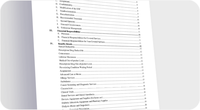 Table of Contents Table of Contents ......................................................................................................................................................... 3 I. Introduction ................................................................................................................................................... 6 II. How Covered Services Work ........................................................................................................................ 6 A. Accessing Care. ........................................................................................................................................ 6 B. Administration of the EOC. ..................................................................................................................... 9 C. Assignment. .............................................................................................................................................. 9 D. Confidentiality.......................................................................................................................................... 9 E. Modification of the EOC. ......................................................................................................................... 9 F. Nondiscrimination. ................................................................................................................................... 9 G. Preauthorization. .................................................................................................................................... 10 H. Recommended Treatment. ..................................................................................................................... 10 I. Second Opinions. ................................................................................................................................... 10 J. Unusual Circumstances. ......................................................................................................................... 10 K. Utilization Management. ........................................................................................................................ 11 III. Financial Responsibilities ........................................................................................................................... 11 A. Premium. ................................................................................................................................................ 11 B. Financial Responsibilities for Covered Services. ................................................................................... 11 C. Financial Responsibilities for Non-Covered Services. ........................................................................... 11 IV. Benefits Details ............................................................................................................................................ 12 Annual Deductible ......................................................................................................................................... 12 Prescription Drug Deductible ........................................................................................................................ 12 Coinsurance ................................................................................................................................................... 12 Lifetime Maximum ....................................................................................................................................... 12 Medical Out-of-pocket Limit ........................................................................................................................ 12 Prescription Drug Out-of-pocket Limit ......................................................................................................... 12 Pre-existing Condition Waiting Period ......................................................................................................... 12 Acupuncture .................................................................................................................................................. 13 Advanced Care at Home ................................................................................................................................ 13 Allergy Services ............................................................................................................................................ 15 Ambulance .................................................................................................................................................... 15 Cancer Screening and Diagnostic Services ................................................................................................... 15 Circumcision ................................................................................................................................................. 16 Clinical Trials ................................................................................................................................................ 16 Dental Services and Dental Anesthesia ......................................................................................................... 16 Devices, Equipment and Supplies (for home use) ......................................................................................... 17 Diabetic Education, Equipment and Pharmacy Supplies .............................................................................. 18 Dialysis (Home and Outpatient) .................................................................................................................... 19 Drugs - Outpatient Prescription ..................................................................................................................... 20 Emergency Services .........................................................................................................