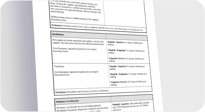 Skilled Nursing Facility Skilled nursing care in a skilled nursing facility when full- After Deductible, Enrollee pays $250 Copayment per time skilled nursing care is necessary in the opinion of the day up to $1,250 per admission attending physician, limited to a total of 150 days per calendar year. Care may include room and board; general nursing care; drugs, biologicals, supplies and equipment ordinarily provided or arranged by a skilled nursing facility; and short- term restorative occupational therapy, physical therapy and speech therapy. Skilled nursing care in a skilled nursing facility requires Preauthorization. Exclusions: Personal comfort items such as telephone and television; rest cures; domiciliary or Convalescent Care Sterilization FDA-approved female sterilization procedures, services and Hospital - Inpatient: No charge; Enrollee pays supplies. See Preventive Services for additional information. nothing Non-Emergency inpatient hospital services require Hospital - Outpatient: No charge; Enrollee pays Preauthorization. nothing Outpatient Services: No charge; Enrollee pays nothing Vasectomy. Hospital - Inpatient: No charge: Enrollee pays nothing Non-Emergency inpatient hospital services require Preauthorization. Hospital - Outpatient: No charge; Enrollee pays nothing Outpatient Services: No charge; Enrollee pays nothing Exclusions: Procedures and services to reverse a sterilization Substance Use Disorder Substance use disorder services including inpatient Hospital - Inpatient: After Deductible, Enrollee Residential Treatment; diagnostic evaluation and education; pays $250 Copayment per day up to $1,250 per organized individual and group counseling; and/or admission prescription drugs unless excluded under Sections IV. or V. Outpatient Services: After Deductible, Enrollee Substance use disorder means a substance-related or addictive pays $30 primary care provider services Copayment disorder listed in the most current version of the Diagnostic and Statistical Manual of Mental Disorders (DSM). For the Group Visits: No charge; Enrollee pays nothing purposes of this section, the definition of Medically PEBB_VA_2024 41