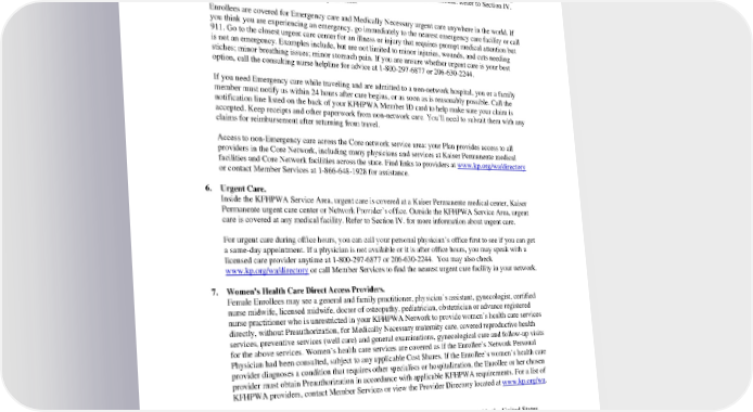 5. Emergency Services. Emergency services at a Network Facility or non-Network Facility are covered. Enrollees must notify KFHPWA by way of the Hospital notification line (1-888-457-9516 as noted on your member identification card) within 24 hours of any admission, or as soon thereafter as medically possible. Coverage for Emergency services at a non-Network Facility is limited to the Allowed Amount. Refer to Section IV. for more information about Emergency services. Enrollees are covered for Emergency care and Medically Necessary urgent care anywhere in the world. If you think you are experiencing an emergency, go immediately to the nearest emergency care facility or call 911. Go to the closest urgent care center for an illness or injury that requires prompt medical attention but is not an emergency. Examples include, but are not limited to minor injuries, wounds, and cuts needing stiches; minor breathing issues; minor stomach pain. If you are unsure whether urgent care is your best option, call the consulting nurse helpline for advice at 1-800-297-6877 or 206-630-2244. If you need Emergency care while traveling and are admitted to a non-network hospital, you or a family member must notify us within 24 hours after care begins, or as soon as is reasonably possible. Call the notification line listed on the back of your KFHPWA Member ID card to help make sure your claim is accepted. Keep receipts and other paperwork from non-network care. You’ll need to submit them with any claims for reimbursement after returning from travel. Access to non-Emergency care across the Core network service area: your Plan provides access to all providers in the Core Network, including many physicians and services at Kaiser Permanente medical facilities and Core Network facilities across the state. Find links to providers at www.kp.org/wa/directory or contact Member Services at 1-866-648-1928 for assistance. 6. Urgent Care. Inside the KFHPWA Service Area, urgent care is covered at a Kaiser Permanente medical center, Kaiser Permanente urgent care center or Network Provider’s office. Outside the KFHPWA Service Area, urgent care is covered at any medical facility. Refer to Section IV. for more information about urgent care. For urgent care during office hours, you can call your personal physician’s office first to see if you can get a same-day appointment. If a physician is not available or it is after office hours, you may speak with a licensed care provider anytime at 1-800-297-6877 or 206-630-2244. You may also check www.kp.org/wa/directory or call Member Services to find the nearest urgent care facility in your network. 7. Women’s Health Care Direct Access Providers. Female Enrollees may see a general and family practitioner, physician’s assistant, gynecologist, certified nurse midwife, licensed midwife, doctor of osteopathy, pediatrician, obstetrician or advance registered nurse practitioner who is unrestricted in your KFHPWA Network to provide women’s health care services directly, without Preauthorization, for Medically Necessary maternity care, covered reproductive health services, preventive services (well care) and general examinations, gynecological care and follow-up visits for the above services. Women’s health care services are covered as if the Enrollee’s Network Personal Physician had been consulted, subject to any applicable Cost Shares. If the Enrollee’s women’s health care provider diagnoses a condition that requires other specialists or hospitalization, the Enrollee or her chosen provider must obtain Preauthorization in accordance with applicable KFHPWA requirements. For a list of KFHPWA providers, contact Member Services or view the Provider Directory located at www.kp.org/wa. 8. Travel Advisory Services. Our Travel Advisory Service offers recommendations tailored to your travel outside the United States. Nurses certified in travel health will advise you on any vaccines or medications you need based on your destination, activities, and medical history. The consultation is not a covered benefit and there is a fee for a KFHPWA Enrollee using the service for the first time. Travel-related vaccinations and medications are usually not covered. Visit www.kp.org/wa/travel-service for more details. PEBB_VA_2024 8