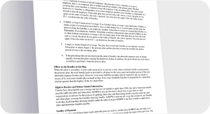 • The plan covering the spouse of the custodial parent, second; • The plan covering the non-custodial parent, third; and then • The plan covering the spouse of the non-custodial parent, last. c) For a dependent child covered under more than one plan of individuals who are not the parents of the child, the provisions of Subsection a) or b) above determine the order of benefits as if those individuals were the parents of the child. 3. Active employee or retired or laid-off employee. The plan that covers a Enrollee as an active employee, that is, an employee who is neither laid off nor retired, is the primary plan. The plan covering that same Enrollee as a retired or laid off employee is the secondary plan. The same would hold true if a Enrollee is a Dependent of an active employee and that same Enrollee is a Dependent of a retired or laid-off employee. If the other plan does not have this rule, and as a result, the plans do not agree on the order of benefits, this rule is ignored. This rule does not apply if the rule under section D.1. can determine the order of benefits. 4. COBRA or State Continuation Coverage. If an Enrollee whose coverage is provided under COBRA or under a right of continuation provided by state or other federal law is covered under another plan, the plan covering the Enrollee as an employee, member, Subscriber or retiree or covering the Enrollee as a Dependent of an employee, member, Subscriber or retiree is the primary plan and the COBRA or state or other federal continuation coverage is the secondary plan. If the other plan does not have this rule, and as a result, the plans do not agree on the order of benefits, this rule is ignored. This rule does not apply if the rule under section D.1. can determine the order of benefits. 5. Longer or shorter length of coverage. The plan that covered the Enrollee as an employee, member, Subscriber or retiree longer is the primary plan and the plan that covered the Enrollee the shorter period of time is the secondary plan. 6. If the preceding rules do not determine the order of benefits, the allowable expenses must be shared equally between the plans meeting the definition of plan. In addition, this plan will not pay more than it would have paid had it been the primary plan. Effect on the Benefits of this Plan. When this plan is secondary, it must make payment in an amount so that, when combined with the amount paid by the primary plan, the total benefits paid or provided by all plans for the claim equal one hundred percent of the total allowable expense for that claim. However, in no event shall the secondary plan be required to pay an amount in excess of its maximum benefit plus accrued savings. In no event should the Enrollee be responsible for a deductible amount greater than the highest of the two deductibles. Right to Receive and Release Needed Information. Certain facts about health care coverage and services are needed to apply these COB rules and to determine benefits payable under this plan and other plans. KFHPWA may get the facts it needs from or give them to other organizations or persons for the purpose of applying these rules and determining benefits payable under this plan and other plans covering the Enrollee claiming benefits. KFHPWA need not tell, or get the consent of, any Enrollee to do this. Each Enrollee claiming benefits under this plan must give KFHPWA any facts it needs to apply those rules and determine benefits payable. Facility of Payment. If payments that should have been made under this plan are made by another plan, KFHPWA has the right, at its discretion, to remit to the other plan the amount it determines appropriate to satisfy the intent of this provision. The amounts paid to the other plan are considered benefits paid under this plan. To the extent of such payments, KFHPWA is fully discharged from liability under this plan. Right of Recovery. KFHPWA has the right to recover excess payment whenever it has paid allowable expenses in excess of the maximum amount of payment necessary to satisfy the intent of this provision. KFHPWA may recover excess payment from any person to whom or for whom payment was made or any other issuers or plans. PEBB_VA_2024 68