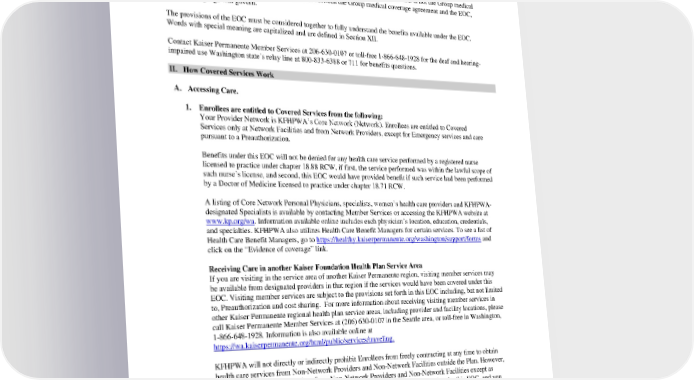 I. Introduction This EOC is a statement of benefits, exclusions and other provisions as set forth in the Group medical coverage agreement between Kaiser Foundation Health Plan of Washington (“KFHPWA”) and the Group. The benefits were approved by the Group who contracts with KFHPWA for health care coverage. This EOC is not the Group medical coverage agreement itself. In the event of a conflict between the Group medical coverage agreement and the EOC, the EOC language will govern. The provisions of the EOC must be considered together to fully understand the benefits available under the EOC. Words with special meaning are capitalized and are defined in Section XII. Contact Kaiser Permanente Member Services at 206-630-0107 or toll-free 1-866-648-1928 for the deaf and hearing- impaired use Washington state’s relay line at 800-833-6388 or 711 for benefits questions. II. How Covered Services Work A. Accessing Care. 1. Enrollees are entitled to Covered Services from the following: Your Provider Network is KFHPWA’s Core Network (Network). Enrollees are entitled to Covered Services only at Network Facilities and from Network Providers, except for Emergency services and care pursuant to a Preauthorization. Benefits under this EOC will not be denied for any health care service performed by a registered nurse licensed to practice under chapter 18.88 RCW, if first, the service performed was within the lawful scope of such nurse’s license, and second, this EOC would have provided benefit if such service had been performed by a Doctor of Medicine licensed to practice under chapter 18.71 RCW. A listing of Core Network Personal Physicians, specialists, women’s health care providers and KFHPWA- designated Specialists is available by contacting Member Services or accessing the KFHPWA website at www.kp.org/wa. Information available online includes each physician’s location, education, credentials, and specialties. KFHPWA also utilizes Health Care Benefit Managers for certain services. To see a list of Health Care Benefit Managers, go to https://healthy.kaiserpermanente.org/washington/support/forms and click on the “Evidence of coverage” link. Receiving Care in another Kaiser Foundation Health Plan Service Area If you are visiting in the service area of another Kaiser Permanente region, visiting member services may be available from designated providers in that region if the services would have been covered under this EOC. Visiting member services are subject to the provisions set forth in this EOC including, but not limited to, Preauthorization and cost sharing. For more information about receiving visiting member services in other Kaiser Permanente regional health plan service areas, including provider and facility locations, please call Kaiser Permanente Member Services at (206) 630-0107 in the Seattle area, or toll-free in Washington, 1-866-648-1928. Information is also available online at https://wa.kaiserpermanente.org/html/public/services/traveling. KFHPWA will not directly or indirectly prohibit Enrollees from freely contracting at any time to obtain health care services from Non-Network Providers and Non-Network Facilities outside the Plan. However, if you choose to receive services from Non-Network Providers and Non-Network Facilities except as otherwise specifically provided in this EOC, those services will not be covered under this EOC, and you will be responsible for the full price of the services. Any amounts you pay for non-covered services will not count toward your Out-of-Pocket Limit. 2. Primary Care Provider Services. KFHPWA recommends that Enrollees select a Network Personal Physician when enrolling. One personal physician may be selected for an entire family, or a different personal physician may be selected for each PEBB_VA_2024 6