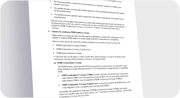 3. If an enrollee is hospitalized An enrollee who is receiving covered services in a hospital on the date medical coverage ends will continue to be eligible for covered services while an inpatient for the condition which the enrollee was hospitalized, until one of the following events occur: • According to this plan’s clinical criteria, it is no longer medically necessary for the enrollee to be an inpatient at the facility. • The remaining benefits available for the hospitalization are exhausted, regardless of whether a new calendar year begins. • The enrollee becomes covered under another agreement with a group health plan that provides benefits for the hospitalization. • The enrollee becomes enrolled under an agreement with another carrier that provides benefits for the hospitalization. This provision will not apply if the enrollee is covered under another agreement that provides benefits for the hospitalization at the time medical coverage ends, except as set forth in this section, or if the enrollee is eligible for PEBB Continuation Coverage as described in “Options for continuing PEBB medical coverage.” 4. Options for continuing PEBB medical coverage When medical coverage ends, the subscriber and their dependents covered by this medical plan may be eligible to continue PEBB medical coverage during temporary or permanent loss of eligibility. There are three options the subscriber and their dependents may qualify for when coverage ends. • PEBB Continuation Coverage (COBRA) • PEBB Continuation Coverage (Unpaid Leave) • PEBB retiree insurance coverage A subscriber also has the right to convert to individual medical insurance coverage with the plan when continuation of group medical insurance coverage is no longer possible. (a) PEBB Continuation Coverage The PEBB Program administers the following continuation coverage options to temporarily extend group insurance coverage when the enrollee’s PEBB medical plan coverage ends due to a qualifying event: • PEBB Continuation Coverage (COBRA) includes eligibility and administrative requirements under federal COBRA laws and regulations. Some enrollees who are not qualified beneficiaries under federal COBRA, may also qualify for PEBB Continuation Coverage (COBRA). • PEBB Continuation Coverage (Unpaid Leave) is an option created by the PEBB Program with wider eligibility criteria and qualifying event types than COBRA. An enrollee who qualifies for both types of PEBB Continuation Coverage (COBRA and Unpaid Leave) may enroll in only one of these options. See “Continuation coverage enrollment” and the PEBB Continuation Coverage Election Notice. Premium payments for PEBB Continuation Coverage If a subscriber enrolls in continuation coverage, the subscriber is responsible for timely payment of premiums and applicable premium surcharges. (b) PEBB retiree insurance coverage The following are eligible to continue enrollment or defer enrollment in PEBB retiree insurance coverage if they meet procedural and substantive eligibility requirements: PEBB_VA_2024 60