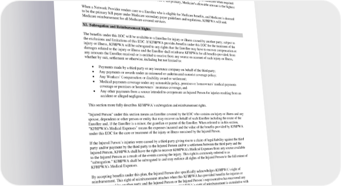 Questions about Coordination of Benefits? Contact the State Insurance Department. Effect of Medicare. Medicare primary/secondary payer guidelines and regulations will determine primary/secondary payer status, and will be adjudicated by KFHPWA as set forth in this section. KFHPWA will pay primary to Medicare when required by federal law. When Medicare, Part A and Part B or Part C are primary, Medicare's allowable amount is the highest allowable expense. When a Network Provider renders care to a Enrollee who is eligible for Medicare benefits, and Medicare is deemed to be the primary bill payer under Medicare secondary payer guidelines and regulations, KFHPWA will seek Medicare reimbursement for all Medicare covered services. XI. Subrogation and Reimbursement Rights The benefits under this EOC will be available to a Enrollee for injury or illness caused by another party, subject to the exclusions and limitations of this EOC. If KFHPWA provides benefits under this EOC for the treatment of the injury or illness, KFHPWA will be subrogated to any rights that the Enrollee may have to recover compensation or damages related to the injury or illness and the Enrollee shall reimburse KFHPWA for all benefits provided, from any amounts the Enrollee received or is entitled to receive from any source on account of such injury or illness, whether by suit, settlement or otherwise, including but not limited to: • Payments made by a third party or any insurance company on behalf of the third party; • Any payments or awards under an uninsured or underinsured motorist coverage policy; • Any Workers’ Compensation or disability award or settlement; • Medical payments coverage under any automobile policy, premises or homeowners’ medical payments coverage or premises or homeowners’ insurance coverage; and • Any other payments from a source intended to compensate an Injured Person for injuries resulting from an accident or alleged negligence. This section more fully describes KFHPWA’s subrogation and reimbursement rights. "Injured Person" under this section means an Enrollee covered by the EOC who sustains an injury or illness and any spouse, dependent or other person or entity that may recover on behalf of such Enrollee including the estate of the Enrollee and, if the Enrollee is a minor, the guardian or parent of the Enrollee. When referred to in this section, "KFHPWA's Medical Expenses" means the expenses incurred and the value of the benefits provided by KFHPWA under this EOC for the care or treatment of the injury or illness sustained by the Injured Person. If the Injured Person’s injuries were caused by a third party giving rise to a claim of legal liability against the third party and/or payment by the third party to the Injured Person and/or a settlement between the third party and the Injured Person, KFHPWA shall have the right to recover KFHPWA's Medical Expenses from any source available to the Injured Person as a result of the events causing the injury. This right is commonly referred to as "subrogation." KFHPWA shall be subrogated to and may enforce all rights of the Injured Person to the full extent of KFHPWA's Medical Expenses. By accepting benefits under this plan, the Injured Person also specifically acknowledges KFHPWA’s right of reimbursement. This right of reimbursement attaches when this KFHPWA has provided benefits for injuries or illnesses caused by another party and the Injured Person or the Injured Person’s representative has recovered any amounts from a third party or any other source of recovery. KFHPWA’s right of reimbursement is cumulative with and not exclusive of its subrogation right and KFHPWA may choose to exercise either or both rights of recovery. In order to secure KFHPWA’s recovery rights, the Injured Person agrees to assign KFHPWA any benefits or claims or rights of recovery they may have under any automobile policy or other coverage, to the full extent of the plan’s subrogation and reimbursement claims. This assignment allows KFHPWA to pursue any claim the Injured Person may have, whether or not they choose to pursue the claim. PEBB_VA_2024 69