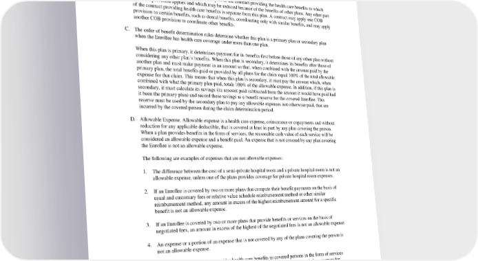 provide medical benefits; Medicare supplement policies; Medicaid coverage; or coverage under other federal governmental plans; unless permitted by law. Each contract for coverage under Subsection 1. or 2. is a separate plan. If a plan has two parts and COB rules apply only to one of the two, each of the parts is treated as a separate plan. B. This plan means, in a COB provision, the part of the contract providing the health care benefits to which the COB provision applies and which may be reduced because of the benefits of other plans. Any other part of the contract providing health care benefits is separate from this plan. A contract may apply one COB provision to certain benefits, such as dental benefits, coordinating only with similar benefits, and may apply another COB provision to coordinate other benefits. C. The order of benefit determination rules determine whether this plan is a primary plan or secondary plan when the Enrollee has health care coverage under more than one plan. When this plan is primary, it determines payment for its benefits first before those of any other plan without considering any other plan’s benefits. When this plan is secondary, it determines its benefits after those of another plan and must make payment in an amount so that, when combined with the amount paid by the primary plan, the total benefits paid or provided by all plans for the claim equal 100% of the total allowable expense for that claim. This means that when this plan is secondary, it must pay the amount which, when combined with what the primary plan paid, totals 100% of the allowable expense. In addition, if this plan is secondary, it must calculate its savings (its amount paid subtracted from the amount it would have paid had it been the primary plan) and record these savings as a benefit reserve for the covered Enrollee. This reserve must be used by the secondary plan to pay any allowable expenses not otherwise paid, that are incurred by the covered person during the claim determination period. D. Allowable Expense. Allowable expense is a health care expense, coinsurance or copayments and without reduction for any applicable deductible, that is covered at least in part by any plan covering the person. When a plan provides benefits in the form of services, the reasonable cash value of each service will be considered an allowable expense and a benefit paid. An expense that is not covered by any plan covering the Enrollee is not an allowable expense. The following are examples of expenses that are not allowable expenses: 1. The difference between the cost of a semi-private hospital room and a private hospital room is not an allowable expense, unless one of the plans provides coverage for private hospital room expenses. 2. If an Enrollee is covered by two or more plans that compute their benefit payments on the basis of usual and customary fees or relative value schedule reimbursement method or other similar reimbursement method, any amount in excess of the highest reimbursement amount for a specific benefit is not an allowable expense. 3. If an Enrollee is covered by two or more plans that provide benefits or services on the basis of negotiated fees, an amount in excess of the highest of the negotiated fees is not an allowable expense. 4. An expense or a portion of an expense that is not covered by any of the plans covering the person is not an allowable expense. E. Closed panel plan is a plan that provides health care benefits to covered persons in the form of services through a panel of providers who are primarily employed by the plan, and that excludes coverage for services provided by other providers, except in cases of Emergency or referral by a panel member. F. Custodial parent is the parent awarded custody by a court decree or, in the absence of a court decree, is the parent with whom the child resides more than one half of the calendar year excluding any temporary visitation. PEBB_VA_2024 66