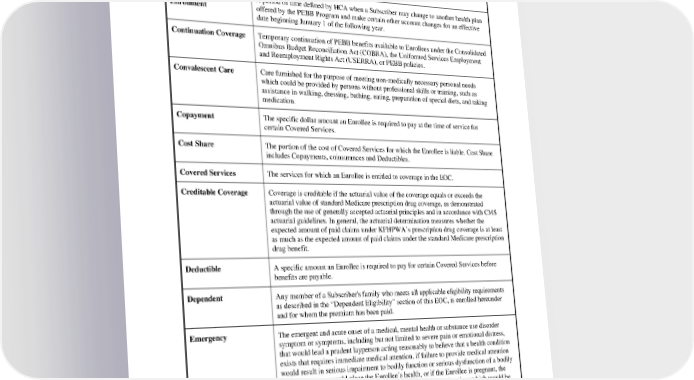 charge for services and the Allowed Amount, except for Emergency services, including post stabilization and for ancillary services received from an out of network provider in a network facility. For more information about balance billing protections, please visit: https://healthy.kaiserpermanente.org/washington/support/forms and click on the “Billing forms” link. Annual Open A period of time defined by HCA when a Subscriber may change to another health plan Enrollment offered by the PEBB Program and make certain other account changes for an effective date beginning January 1 of the following year. Continuation Coverage Temporary continuation of PEBB benefits available to Enrollees under the Consolidated Omnibus Budget Reconciliation Act (COBRA), the Uniformed Services Employment and Reemployment Rights Act (USERRA), or PEBB policies. Convalescent Care Care furnished for the purpose of meeting non-medically necessary personal needs which could be provided by persons without professional skills or training, such as assistance in walking, dressing, bathing, eating, preparation of special diets, and taking medication. Copayment The specific dollar amount an Enrollee is required to pay at the time of service for certain Covered Services. Cost Share The portion of the cost of Covered Services for which the Enrollee is liable. Cost Share includes Copayments, coinsurances and Deductibles. Covered Services The services for which an Enrollee is entitled to coverage in the EOC. Creditable Coverage Coverage is creditable if the actuarial value of the coverage equals or exceeds the actuarial value of standard Medicare prescription drug coverage, as demonstrated through the use of generally accepted actuarial principles and in accordance with CMS actuarial guidelines. In general, the actuarial determination measures whether the expected amount of paid claims under KFHPWA’s prescription drug coverage is at least as much as the expected amount of paid claims under the standard Medicare prescription drug benefit. Deductible A specific amount an Enrollee is required to pay for certain Covered Services before benefits are payable. Dependent Any member of a Subscriber's family who meets all applicable eligibility requirements as described in the “Dependent Eligibility” section of this EOC, is enrolled hereunder and for whom the premium has been paid. Emergency The emergent and acute onset of a medical, mental health or substance use disorder symptom or symptoms, including but not limited to severe pain or emotional distress, that would lead a prudent layperson acting reasonably to believe that a health condition exists that requires immediate medical attention, if failure to provide medical attention would result in serious impairment to bodily function or serious dysfunction of a bodily organ or part, or would place the Enrollee’s health, or if the Enrollee is pregnant, the health of the unborn child, in serious jeopardy, or any other situations which would be considered an emergency under applicable federal or state law. A division, department, or separate agency of state government, including an institution Employing Agency of higher education; a county, municipality, or other political subdivision; and a tribal government covered by HCA statute. PEBB_VA_2024 71