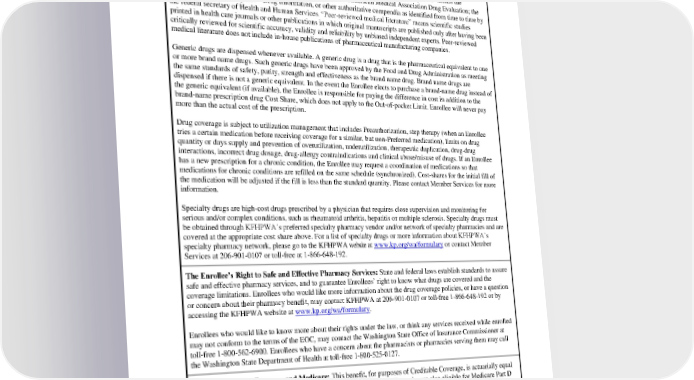 under federal or state law, be dispensed only pursuant to a prescription order. These drugs, including off-label use of FDA-approved drugs (provided that such use is documented to be effective in one of the standard reference compendia; a majority of well-designed clinical trials published in peer-reviewed medical literature document improved efficacy or safety of the agent over standard therapies, or over placebo if no standard therapies exist; or by the federal secretary of Health and Human Services) are covered. “Standard reference compendia” means the American Hospital Formulary Service – Drug Information; the American Medical Association Drug Evaluation; the United States Pharmacopoeia – Drug Information, or other authoritative compendia as identified from time to time by the federal secretary of Health and Human Services. “Peer-reviewed medical literature” means scientific studies printed in health care journals or other publications in which original manuscripts are published only after having been critically reviewed for scientific accuracy, validity and reliability by unbiased independent experts. Peer-reviewed medical literature does not include in-house publications of pharmaceutical manufacturing companies. Generic drugs are dispensed whenever available. A generic drug is a drug that is the pharmaceutical equivalent to one or more brand name drugs. Such generic drugs have been approved by the Food and Drug Administration as meeting the same standards of safety, purity, strength and effectiveness as the brand name drug. Brand name drugs are dispensed if there is not a generic equivalent. In the event the Enrollee elects to purchase a brand-name drug instead of the generic equivalent (if available), the Enrollee is responsible for paying the difference in cost in addition to the brand-name prescription drug Cost Share, which does not apply to the Out-of-pocket Limit. Enrollee will never pay more than the actual cost of the prescription. Drug coverage is subject to utilization management that includes Preauthorization, step therapy (when an Enrollee tries a certain medication before receiving coverage for a similar, but non-Preferred medication), limits on drug quantity or days supply and prevention of overutilization, underutilization, therapeutic duplication, drug-drug interactions, incorrect drug dosage, drug-allergy contraindications and clinical abuse/misuse of drugs. If an Enrollee has a new prescription for a chronic condition, the Enrollee may request a coordination of medications so that medications for chronic conditions are refilled on the same schedule (synchronized). Cost-shares for the initial fill of the medication will be adjusted if the fill is less than the standard quantity. Please contact Member Services for more information. Specialty drugs are high-cost drugs prescribed by a physician that requires close supervision and monitoring for serious and/or complex conditions, such as rheumatoid arthritis, hepatitis or multiple sclerosis. Specialty drugs must be obtained through KFHPWA’s preferred specialty pharmacy vendor and/or network of specialty pharmacies and are covered at the appropriate cost share above. For a list of specialty drugs or more information about KFHPWA’s specialty pharmacy network, please go to the KFHPWA website at www.kp.org/wa/formulary or contact Member Services at 206-901-0107 or toll-free at 1-866-648-192. The Enrollee’s Right to Safe and Effective Pharmacy Services: State and federal laws establish standards to assure safe and effective pharmacy services, and to guarantee Enrollees’ right to know what drugs are covered and the coverage limitations. Enrollees who would like more information about the drug coverage policies, or have a question or concern about their pharmacy benefit, may contact KFHPWA at 206-901-0107 or toll-free 1-866-648-192 or by accessing the KFHPWA website at www.kp.org/wa/formulary. Enrollees who would like to know more about their rights under the law, or think any services received while enrolled may not conform to the terms of the EOC, may contact the Washington State Office of Insurance Commissioner at toll-free 1-800-562-6900. Enrollees who have a concern about the pharmacists or pharmacies serving them may call the Washington State Department of Health at toll-free 1-800-525-0127. Prescription Drug Coverage and Medicare: This benefit, for purposes of Creditable Coverage, is actuarially equal to or greater than the Medicare Part D prescription drug benefit. Enrollees who are also eligible for Medicare Part D can remain covered and will not be subject to Medicare-imposed late enrollment penalties should they decide to enroll in a Medicare Part D plan at a later date; however, the Enrollee could be subject to payment of higher Part D premiums if the Enrollee subsequently has a break in creditable coverage of 63 continuous days or longer before enrolling in a Part D plan. An Enrollee who discontinues coverage must meet eligibility requirements in order to re- enroll. PEBB_VA_2024 23