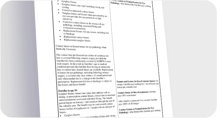Enrollees age 19 and over: No charge; Enrollee pays nothing limited to an Eyeglass frames, lenses (any type), lens options such as Allowance of $150 every 24 months tinting, or prescription contact lenses, contact lens evaluations and examinations associated with their fitting. The benefit After Allowance, Enrollee pays 100% of all charges period begins on the date services are first obtained. The Allowance may be used toward the following in any Contact Lenses or Framed Lenses for Eye combination: Pathology: After Deductible, Enrollee pays nothing • Eyeglass frames • Eyeglass lenses (any type) including tinting and coating • Corrective industrial (safety) lenses • Sunglass lenses and frames when prescribed by an eye care provider for eye protection or light sensitivity • Corrective contact lenses in the absence of eye pathology, including associated fitting and evaluation examinations • Replacement frames, for any reason, including loss or breakage • Replacement contact lenses • Replacement eyeglass lenses Contact lenses or framed lenses for eye pathology when Medically Necessary. One contact lens per diseased eye in lieu of an intraocular lens is covered following cataract surgery provided the Enrollee has been continuously covered by KFHPWA since such surgery. In the event an Enrollee’s age or medical condition prevents the Enrollee from having an intraocular lens or contact lens, framed lenses are available. Replacement of lenses for eye pathology, including following cataract surgery, is covered only once within a 12-month period and only when needed due to a change in the Enrollee’s prescription. Replacement for loss or breakage is subject to the frames and lenses benefit. Frames and Lenses (in lieu of contract lenses): No charge; Enrollee pays nothing for 1 set of frames and Enrollee to age 19: lenses per calendar year Eyeglass frames, lenses (any type), lens options such as tinting, or prescription contact lenses, contact lens evaluations Contact lenses (in lieu of eyeglasses): Enrollee and examinations associated with their fitting. The benefit pays 50% coinsurance period begins on January 1 and continues through the end of the calendar year. The benefit may be used toward contact After benefit is exhausted: Not covered; Enrollee lenses (in lieu of eyeglasses) or 1 eyeglass frame and pair of pays 100% of all charges lenses. • Eyeglass frames Contact Lenses or Framed lenses for Eye • Eyeglass lenses (any type) including tinting and coating Pathology: After Deductible, Enrollee pays nothing • Corrective industrial (safety) lenses • Corrective contact lenses in the absence of eye pathology, including associated fitting and evaluation examinations Contact lenses or framed lenses for eye pathology when Medically Necessary. PEBB_VA_2024 35