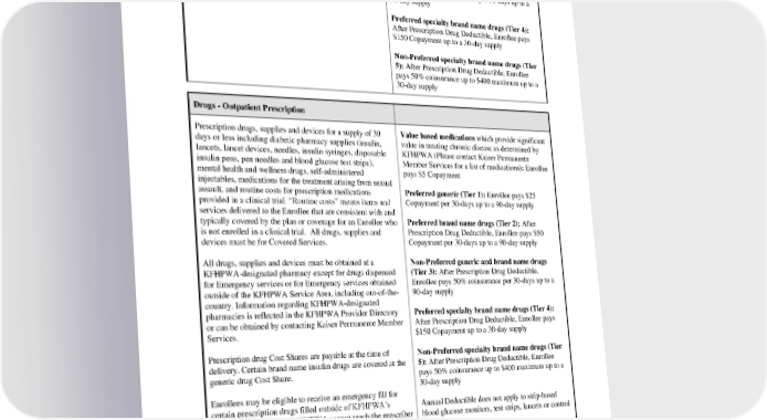 Copayment per 30-days up to a 90-day supply Non-Preferred generic and brand name drugs (Tier 3): After Prescription Drug Deductible, Enrollee pays 50% coinsurance per 30-days up to a 90-day supply Preferred specialty brand name drugs (Tier 4): After Prescription Drug Deductible, Enrollee pays $150 Copayment up to a 30-day supply Non-Preferred specialty brand name drugs (Tier 5): After Prescription Drug Deductible, Enrollee pays 50% coinsurance up to $400 maximum up to a 30-day supply Drugs - Outpatient Prescription Prescription drugs, supplies and devices for a supply of 30 Value based medications which provide significant days or less including diabetic pharmacy supplies (insulin, value in treating chronic disease as determined by lancets, lancet devices, needles, insulin syringes, disposable KFHPWA (Please contact Kaiser Permanente insulin pens, pen needles and blood glucose test strips), Member Services for a list of medications): Enrollee mental health and wellness drugs, self-administered pays $5 Copayment injectables, medications for the treatment arising from sexual assault, and routine costs for prescription medications Preferred generic (Tier 1): Enrollee pays $25 provided in a clinical trial. “Routine costs” means items and Copayment per 30-days up to a 90-day supply services delivered to the Enrollee that are consistent with and typically covered by the plan or coverage for an Enrollee who Preferred brand name drugs (Tier 2): After is not enrolled in a clinical trial. All drugs, supplies and Prescription Drug Deductible, Enrollee pays $50 devices must be for Covered Services. Copayment per 30-days up to a 90-day supply All drugs, supplies and devices must be obtained at a Non-Preferred generic and brand name drugs KFHPWA-designated pharmacy except for drugs dispensed (Tier 3): After Prescription Drug Deductible, for Emergency services or for Emergency services obtained Enrollee pays 50% coinsurance per 30-days up to a outside of the KFHPWA Service Area, including out-of-the- 90-day supply country. Information regarding KFHPWA-designated pharmacies is reflected in the KFHPWA Provider Directory Preferred specialty brand name drugs (Tier 4): or can be obtained by contacting Kaiser Permanente Member After Prescription Drug Deductible, Enrollee pays Services. $150 Copayment up to a 30-day supply Prescription drug Cost Shares are payable at the time of Non-Preferred specialty brand name drugs (Tier delivery. Certain brand name insulin drugs are covered at the 5): After Prescription Drug Deductible, Enrollee generic drug Cost Share. pays 50% coinsurance up to $400 maximum up to a 30-day supply Enrollees may be eligible to receive an emergency fill for certain prescription drugs filled outside of KFHPWA’s Annual Deductible does not apply to strip-based business hours or when KFHPWA cannot reach the prescriber blood glucose monitors, test strips, lancets or control for consultation. For emergency fills, Enrollees pay the solutions. prescription drug Cost Share for each 7-day supply or less, or the minimum packaging size available at the time the Note: An Enrollee will not pay more than $35, not emergency fill is dispensed. A list of prescription drugs subject to the Deductible, for a 30-day supply of eligible for emergency fills is available on the pharmacy insulin to comply with state law requirements. Any website at www.kp.org/wa/formulary. Enrollees can request cost sharing paid will apply toward the annual PEBB_VA_2024 20