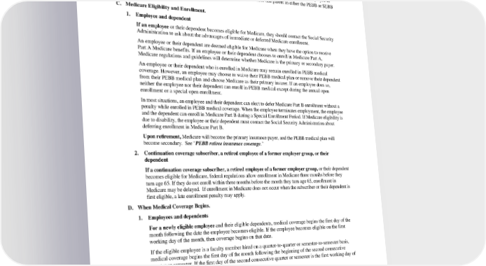For example: • A child who is an eligible dependent under two parents enrolled in PEBB Program benefits may be enrolled as a dependent under both parents but is limited to a single enrollment in PEBB medical. • A child who is an eligible dependent of an employee in the PEBB Program and a school employee in the SEBB Program may only be enrolled as a dependent under one parent in either the PEBB or SEBB Program. C. Medicare Eligibility and Enrollment. 1. Employee and dependent If an employee or their dependent becomes eligible for Medicare, they should contact the Social Security Administration to ask about the advantages of immediate or deferred Medicare enrollment. An employee or their dependent are deemed eligible for Medicare when they have the option to receive Part A Medicare benefits. If an employee or their dependent chooses to enroll in Medicare Part A, Medicare regulations and guidelines will determine whether Medicare is the primary or secondary payer. An employee or their dependent who is enrolled in Medicare may remain enrolled in PEBB medical coverage. However, an employee may choose to waive their PEBB medical plan or remove their dependent from their PEBB medical plan and choose Medicare as their primary insurer. If an employee does so, neither the employee nor their dependent can enroll in PEBB medical except during the annual open enrollment or a special open enrollment. In most situations, an employee and their dependent can elect to defer Medicare Part B enrollment without a penalty while enrolled in PEBB medical coverage. When the employee terminates employment, the employee and the dependent can enroll in Medicare Part B during a Special Enrollment Period. If Medicare eligibility is due to disability, the employee or their dependent must contact the Social Security Administration about deferring enrollment in Medicare Part B. Upon retirement, Medicare will become the primary insurance payer, and the PEBB medical plan will become secondary. See “PEBB retiree insurance coverage.” 2. Continuation coverage subscriber, a retired employee of a former employer group, or their dependent If a continuation coverage subscriber, a retired employee of a former employer group, or their dependent becomes eligible for Medicare, federal regulations allow enrollment in Medicare three months before they turn age 65. If they do not enroll within three months before the month they turn age 65, enrollment in Medicare may be delayed. If enrollment in Medicare does not occur when the subscriber or their dependent is first eligible, a late enrollment penalty may apply. D. When Medical Coverage Begins. 1. Employees and dependents For a newly eligible employee and their eligible dependents, medical coverage begins the first day of the month following the date the employee becomes eligible. If the employee becomes eligible on the first working day of the month, then coverage begins on that date. If the eligible employee is a faculty member hired on a quarter-to-quarter or semester-to-semester basis, medical coverage begins the first day of the month following the beginning of the second consecutive quarter or semester. If the first day of the second consecutive quarter or semester is the first working day of the month, medical coverage begins on that day. For an employee regaining eligibility, including following a period of leave or after being between periods of leave described in PEBB Program rules, and their eligible dependents, medical coverage begins the first day of the month the employee is in pay status eight or mor hours. If the employee is a faculty member regaining eligibility no later than the 12th month after the month in which they lost eligibility for the employer contribution toward PEBB benefits, medical coverage begins the first day of the month in which the quarter or semester begins. PEBB_VA_2024 52