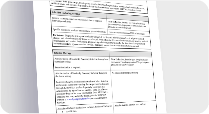 Coverage for Emergency services in a non-Network Facility and subsequent transfer to a Network Facility is set forth in Emergency Services. Non-Emergency hospital services require Preauthorization. Exclusions: Take home drugs, dressings and supplies following hospitalization; internally implanted insulin pumps, artificial larynx and any other implantable device that have not been approved by KFHPWA’s medical director Infertility (including sterility) General counseling and one consultation visit to diagnose After Deductible, Enrollee pays $30 primary care infertility conditions. provider services Copayment or $50 specialty care provider services Copayment Specific diagnostic services, treatment and prescription drugs. Not covered; Enrollee pays 100% of all charges Exclusions: Diagnostic testing and medical treatment of sterility and infertility regardless of origin or cause; all charges and related services for donor materials; all forms of artificial intervention for any reason including artificial insemination and in-vitro fertilization; prognostic (predictive) genetic testing for the detection of congenital and heritable disorders; cryopreservation services; surrogacy; any services not specifically listed as covered Infusion Therapy Administration of Medically Necessary infusion therapy in an After Deductible, Enrollee pays $30 primary care outpatient setting. provider services Copayment or $50 specialty care provider services Copayment Preauthorization is required. Administration of Medically Necessary infusion therapy in No charge; Enrollee pays nothing the home setting. To receive benefits for the administration of select infusion medications in the home setting, the drugs must be obtained through KFHPWA’s preferred specialty pharmacy and administered by a provider we identify. For a list of these specialty drugs or for more information about KFHPWA’s specialty pharmacy network, please go to the KFHPWA website at www.kp.org/wa/formulary or contact Member Services. Associated infused medications includes, but is not limited to: After Deductible, Enrollee pays nothing • Antibiotics. • Hydration. • Chemotherapy. • Pain management. Preauthorization is required. PEBB_VA_2024 28