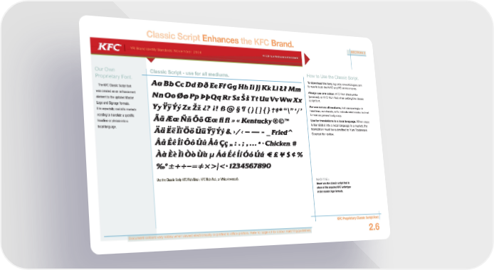 Classic Script Enhances the KFC Brand. SECTION 2 YRI Brand Identity Standards: November 2006 © 2006 Yum Restaurants International Our Own Classic Script - use for all mediums. How to Use the Classic Script. Proprietary Font. To download the font, log onto www.kfclogos.com for use in both the MAC and PC environments. The KFC Classic Script font Always use one colour, KFC Rich Black,white was created as an enhancement (reversed), or KFC Rich Red when setting the classic script font. element to the updated Master Logo and Signage formats. For use across all mediums, but use sparingly – in headlines, sub-heads, or to indicate retail costs– but not It is especially useful to markets for use as general body copy. needing to translate a specific Use for translations to a local language. When copy headline or phrase into a is translated into a local language in a market, the local language. translation must be submitted to Yum Trademark Counsel for review. • Use the Classic Scrip KFC Rich Black, KFC Rich Red, or White (reversed). NOTE: Never use the classic script font in place of the required KFC Lettertype in the master logo formats. KFC Proprietary Classic Script Font Document colours vary widely when viewed electronically or printed to office printers. Refer to page 4.1 for colour matching guidelines. 2.6
