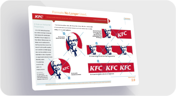 Formats No Longer Used. SECTION 2 YRI Brand Identity Standards: November 2006 © 2006 Yum Restaurants International A Note on Horizontal These formats have all been retired, either because they no longer reflect the current brand spirit, NO Proportions: or they are problematic for use in the field. Do not use any of these formats on new or remodeled buildings, or in new graphic applications. Do not use Horizontal In the 1997 Identity Manual there formats longer than a 2 x 1 proportion with was no limit to the length of horizontal NO either the old logo or fascia signage with repeating logos. modernized logo, or the Do not use the KFC lettertype. Repeating the logo in signage is no Vertical Oval format. longer allowed. Moving forward, the signage must be replicated in the NO exact logo proportions shown in this manual. Any site-specific exceptions, such as landlord-controlled signage sizes, must be submitted to market leadership for review. All questions on usage should be directed to Senior Do not repeat the logo, with either the old logo or modernized logo. Marketing Leaders. The updated logo NO proportions also apply to re- imaging programs. NOTE: For replacement Do not use the signage guidelines refer Horizontal Oval format. Do not repeat the lettertype in either the old or updated style. to the GFP Development Standards Library Vol. IV. NO Retired Formats Document colours vary widely when viewed electronically or printed to office printers. Refer to page 4.1 for colour matching guidelines. 2.9