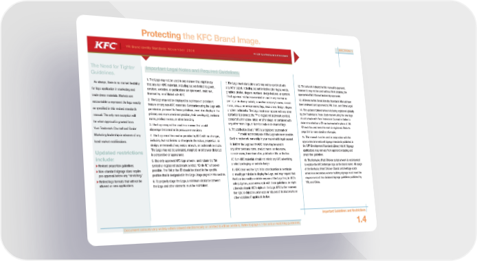 Protecting the KFC Brand Image. SECTION 1 YRI Brand Identity Standards: November 2006 © 2006 Yum Restaurants International The Need for Tighter Important Legal Notes and Required Guidelines. Guidelines. 1. The Logo may not be used in any manner that might imply 7. The Logo must stand alone and may not be combined with 12. The artwork included in this manual is approved, As always, there is no market flexibility that any non-KFC materials, including but not limited to goods, any other object, including but not limited to other logos, words, however it may not be used without first obtaining the for logo application in marketing and services, websites, or publications are sponsored, endorsed, graphics, photos, slogans, numbers, design features, or symbols. appropriate BMU Market leadership approvals. licensed by, or affiliated with KFC. The Logo must not be incorporated or used in any manner as 13. All items in this Brand Identity Standards Manual have trade dress materials. Markets are part of, or in close proximity to another companys name, domain been reviewed and approved by YRI, Yum, and China Legal. 2. The Logo may not be displayed as a primary or prominent accountable to represent the logo exactly feature on any non-KFC materials. Companies using the Logo with name, product or service name, logo, trade dress, design, slogan, 14. The updated Colonel artwork is being registered globally as specified in this revised standards permission, pursuant to these guidelines, must also display in the or other trademarks. The Logo must never appear with any other by the Trademarks Team. Each market using the new logo primary and more prominent position, their own logo(s), business symbol or icon (except the ™ or registered trademark symbol); should check with Yum Trademark Counsel in Dallas to manual. The only rare exception will name, product names, or other branding. contained within a box, circle, or other shape; or combined with ® can be inserted in place of TM. be when approval is granted from any other name, logo, or icon to create a co-branded logo. determine whether a 3. The Logo may not be used in a manner that would ® must be used once the mark is registered. Refer to Yum Trademark Counsel and Senior disparage the brand or its products or services. 8. The attribution clause “KFC is a registered trademark of page 2.8 for more detail on this topic. Marketing leadership in advance of any 4. The Logo must be used as provided by KFC with no changes, ______” should accompany use of the Logo whenever possible. 15. This manual must be used in conjunction with the including but not limited to changes in the colour, proportion, or Confirm trademark ownership in your market with legal counsel. appropriate international signage standards published in local market modifications. 9. Neither the Logo nor the KFC name may be used in design, or removal of any words, artwork, or trademark symbols. the GFP Development Standards Library Vol. IV. Signage The Logo may not be animated, morphed, or otherwise distorted any other company name, product name, service name, applications may not vary from approved cropping and Updated restrictions in perspective or appearance. domain name, franchisee sites, publication title, or the like. proportion guidelines. include: 5. Use only approved KFC logo artwork, and include the TM 10. Non-KFC materials should not mimic any KFC advertising, 16. The Kentucky Fried Chicken script artwork is not intended Revised proportion guidelines. symbol or registered trademark symbol, “Circle-R,” whenever product packaging, or website design. to replace the KFC lettertype logo as the brand name. All usage ® should be placed in the specific of the Kentucky Fried Chicken Classic and Heritage script Non-standard signage sizes require possible. The TM or the 11. KFC deserves the right in its sole discretion to terminate pre-approval before any “stretching.” position that is designated in the Logo Usage pages in this section. or modify permission to display the Logo, and may request that artwork as secondary exterior building signage must meet the Retired logo formats that will not be 6. To properly stage the Logo, a minimum clearance between third parties modify or delete any use of the Logo that, in KFCs requirements of the divisional signage guidelines published by allowed on new applications. the Logo and other elements must be maintained. sole judgment, does not comply with these guidelines, or might YRI, and China. otherwise impair KFCs rights in the Logo. KFC further reserves the right to object to unfair uses or misuses of its trademarks or other violations if applicable by law. Important Guidelines and Restrictions Document colours vary widely when viewed electronically or printed to office printers. Refer to page 4.1 for colour matching guidelines. 1.4