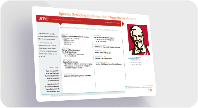 Specific Branding Guidelines for International Markets. YRI Brand Identity Standards: November 2006 © 2006 Yum Restaurants International Welcome to the YRI Version of the KFC Brand Identity Standards Manual! This update has been created to SECTION 1.2 - SECTION 2.13 - provide additional artwork and guidelines Additions to the master logo elements overview Removal of Tilted Bucket Art in Apparel Its Finger Lickin Good Script The Tilted Bucket Art is not approved tailored for International locations. KFC Delivery Logos for use internationally. KFC Express Logos If you have received a CD Classic Script SECTION 3.3 - New! or a printed copy of the June 2006 Addition of Its Finger Lickin Good Script Formats Global Standards Manual, you will SECTION 2.1 - Removal of Tilted Bucket Art in SECTION 3.4 - New! want to note the highlighted updates the Master Logo Formats Addition of KFC Delivery Logos listed by Section and Page numbers The Tilted Bucket Art is not approved to the right. for use internationally. SECTION 3.5 - New! This is the modern face Addition of KFC Express Logos SECTION 2.2 - of KFC and its set to Signage Format Overview SECTION 4.6 - New! propel the brand forward The KFC Bright Red halo is now optional on signage. Addition of 3M Signage Colour Matching Samples into the 21st century. Clarification on the use of Left Tilt and Right Tilt NOTES: Buckets for signage is included. Pages 2.1, 2.6, and 2.12 of the June 2006 Global SECTION 2.6 - New! Brand Identity Standards Addition of KFC Proprietary Classic Script Font should be disregarded for international use. Direct all questions to the International Marketing Team in Dallas, and to the Yum Trademarks Team. YRI Reference Manual for the Updated KFC Image 1.0