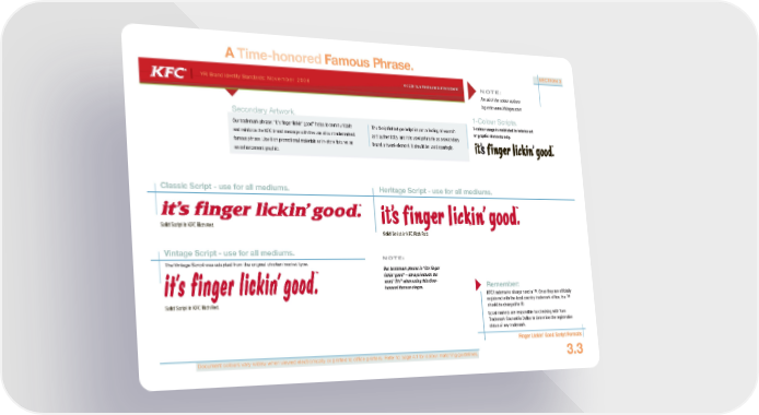 A Time-honored Famous Phrase. SECTION 3 YRI Brand Identity Standards: November 2006 © 2006 Yum Restaurants International NOTE: For all of the colour options log onto www.kfclogos.com Secondary Artwork. 1-Colour Scripts. Our trademark phrase: “its finger lickin good” helps to communicate The Script lettertype helps impart a feeling of warmth 1-colour usage is restricted to interior art and reinforce the KFC brand message with the use of our trademarked, or graphic elements only. and authenticity, and it is used primarily as a secondary famous phrase. Use it on promotional materials or in-store fixtures as brand artwork element. It should be used sparingly. an enhancement graphic. Classic Script - use for all mediums. Heritage Script - use for all mediums. Solid Script in KFC Rich Red. Solid Script in KFC Rich Red. Vintage Script - use for all mediums. NOTE: The Vintage Script was adapted from the original chicken bucket type. Our trademark phrase is “its finger lickin good” – always include the word “its” when using this time- Remember: honored famous slogan. TM KFC trademarks always need a . Once they are officially TM Solid Script in KFC Rich Red. registered with the local country trademark office, the should be changed to ®. Local markets are responsible for checking with Yum Trademark Counsel in Dallas to determine the registration status of any trademark. Finger Lickin Good Script Formats Document colours vary widely when viewed electronically or printed to office printers. Refer to page 4.1 for colour matching guidelines. 3.3