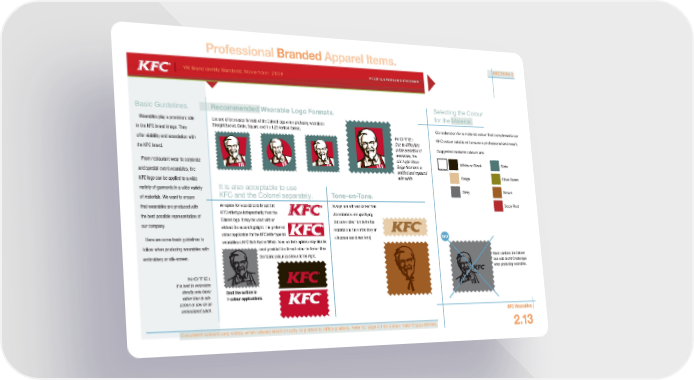 Professional Branded Apparel Items. SECTION 2 YRI Brand Identity Standards: November 2006 © 2006 Yum Restaurants International Recommended Wearable Logo Formats. Selecting the Colour Basic Guidelines. for the MaMatteerialrial.. Wearables play a prominent role Use one of the master formats of the Colonel logo when producing wearables: Straight Bucket, Circle, Square, and 1 x 1.25 Vertical format. Consideration for a material colour that compliments our in the KFC brand image. They NOTE: KFC colour palette will ensure a professional end result. offer visibility and association with Due to difficulties the KFC brand. in the execution of Suggested material colours are: wearables, the From restaurant-wear to corporate KFC Light Warm White or Black Slate Beige face tone is and special-event wearables, the omitted and replaced with white. Beige Olive Green KFC logo can be applied to a wide variety of garments in a wide variety It is also acceptable to use Grey Brown of materials. We want to ensure KFC and the Colonel separately. Tone-on-Tone. that wearables are produced with An option for wearables is to use the Always use a thread darker than Deep Red the best possible representation of KFC lettertype independently from the the material when specifying Colonel logo. It may be used with or the same colour family for the our company. without the accent highlight. The preferred material and the embroidery or colour application for the KFC lettertype on silkscreen (as shown here). NO Here are some basic guidelines to wearables is KFC Rich Red or White. Tone-on-tone options may also be follow when producing wearables with used provided the thread colour is darker than embroidery or silk-screen. the fabric colour as shown to the right. Never combine the Colonel Icon with the KFC lettertype when producing wearables. NOTE: It is best to embroider directly onto fabric Omit the outline in rather than to silk- 1-colour applications. screen or sew on an embroidered patch. KFC Wearables Document colours vary widely when viewed electronically or printed to office printers. Refer to page 4.1 for colour matching guidelines. 2.13