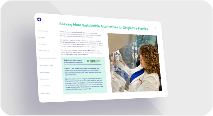 15 Kimberly-Clark Professional’s RightCycle program was the first large-scale recycling effort for non-hazardous lab, cleanroom, and industrial waste Personal Protective Equipment (PPE). Now in its tenth year, the program has enabled our North America customers to divert over 1,600 metric tons of PPE and other waste from landfills. As part of our aspiration to be at the forefront of the transition to a circular economy, we are expanding RightCycle’s scale to include even more products, including hand towels in 2021. RightCycle Celebrates a Decade of Innovation Seeking More Sustainable Alternatives for Single Use Plastics The race to prevent the adverse impacts of single use plastics in the environment relies on the deployment of new, more sustainable alternatives that offer comparable or superior quality and performance. One example of how Kimberly-Clark is tackling this innovation challenge is through a partnership with RWDC Industries which combines Kimberly-Clark’s deep expertise in nonwoven technologies and resin development with RWDC’s innovative marine- and soil-biodegradable biopolymer solutions. This collaboration could help to unlock the innovation needed to replace traditional fossil fuel-based plastics in our hygiene products with materials that can be more effectively managed after use. About This Report Social Impact Our Strategy Inclusion & Diversity Environment, Health and Safety Product Quality & Safety Plastics Footprint Forest Footprint Carbon Footprint Water Footprint