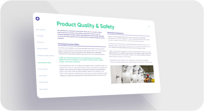13 Promoting Consumer Safety Around the world, we employ over 100 dedicated personnel focused on ensuring product safety. The Quality, Regulatory and Compliance organization partners with our development teams to help ensure our products are safe for their intended use, and assure their compliance with applicable governmental regulations and our own corporate standards. In 2021, our teams completed more than 3,600 safety and compliance assessments of new ingredients, raw materials, finished products, design changes, and market expansions. Over the past several years, we’ve aligned with emerging public and scientific consensus on ingredients of concern by removing microbeads, triclosan, and nonylphenol ethoxylates from Kimberly-Clark products, and focusing on the removal of parabens and phenoxyethanol from our baby wipes. In 2020, we joined the Green Chemistry and Commerce Council (GC3), a multi-stakeholder collaborative that helps drive the commercial adoption of green chemistry by catalyzing and guiding action across industries, sectors, and supply chains. Enhancing Transparency To give our consumers greater peace of mind, we’re also working to provide greater transparency into our product ingredients — a major undertaking, given that our brands offer hundreds of products around the world, incorporating thousands of ingredients. In the near term, we remain focused on publishing ingredient information for products on our corporate website to provide greater transparency into our consumer tissue products as well as our tissue and formulated professional products in the North American market. In 2021, we accelerated the progress of this work by adding ingredient information on priority regional products, such as personal care wet wipes in South America, Europe, and Asia Pacific, and baby care products in South America. Further, our North American feminine care brands added ingredient disclosures to their websites. Looking ahead, we will continue our work to disclose our consumer product ingredient information worldwide, giving consumers additional data to help them make informed choices. Product Quality & Safety The well-being of our consumers is a top priority, which is why it is our policy to deliver products that are in accordance with regulatory requirements and meet or exceed consumer expectations. We take a science-based approach to product safety, and aspire to use only the safest ingredients and to provide open and transparent details about those ingredients. About This Report Social Impact Our Strategy Inclusion & Diversity Environment, Health and Safety Product Quality & Safety Plastics Footprint Forest Footprint Carbon Footprint Water Footprint