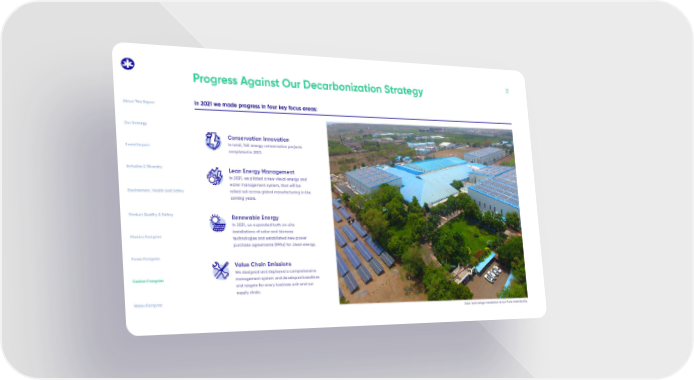 19 In 2021 we made progress in four key focus areas: Conservation Innovation In total, 140 energy conservation projects completed in 2021. Lean Energy Management In 2021, we piloted a new visual energy and water management system, that will be rolled out across global manufacturing in the coming years. Renewable Energy In 2021, we expanded both on-site installations of solar and biomass technologies and established new power purchase agreements (PPAs) for clean energy. Value Chain Emissions We designed and deployed a comprehensive management system and developed baselines and targets for every business unit and our supply chain. Progress Against Our Decarbonization Strategy Solar technology installation at our Pune India facility. About This Report Social Impact Our Strategy Inclusion & Diversity Environment, Health and Safety Product Quality & Safety Plastics Footprint Forest Footprint Carbon Footprint Water Footprint