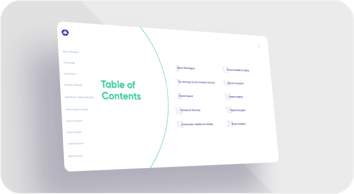 2 3 13 14 16 18 21 7 8 12 10 About This Report Our Strategy for the Decisive Decade Social Impact Inclusion & Diversity Environment, Health and Safety Product Quality & Safety Plastics Footprint Forest Footprint Carbon Footprint Water Footprint Table of Contents About This Report Social Impact Our Strategy Inclusion & Diversity Environment, Health and Safety Product Quality & Safety Plastics Footprint Forest Footprint Carbon Footprint Water Footprint