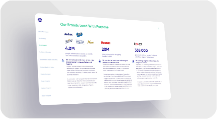 9 Our Brands Lead With Purpose We champion a world where all can enjoy access to clean water, sanitation, and hygiene. Kimberly-Clark’s Toilets Change Lives program helps provide some of the world's most vulnerable communities with improved access to reliable and safe sanitation, reaching 4.0 million people across 15 countries since 2014. In partnership with non-governmental organizations (NGOs) such as Water For People, WaterAid, and Plan International, the program provided resources in four countries in 2021: Bangladesh, Nigeria, Uganda, and El Salvador. 1 We care for the health and well-being of people at all stages of life. Providing the essential products, information, and care to help keep vulnerable mothers and babies healthy throughout the babyhood journey is a foundational social commitment of our Huggies brand. Through partnerships with the National Diaper Bank Network, Red Cross Disaster Relief, UNICEF, and others, Huggies donated over 20 million diapers to struggling families in 2021 in the U.S. alone. Huggies also sponsored Hand to Hold, an initiative that in 2021 provided critical resources, educational materials, and virtual support to 18,394 mothers and families struggling with the trauma of having their brand-new baby in intensive care. 2 We challenge stigmas and champion the progress of women. Supporting our unwavering belief that a period should never get in the way of a woman’s progress, Kotex and the Kimberly-Clark Foundation contributed $625,000 in 2021 to help bring menstrual health education and training to girls in Guatemala and Peru. This financial commitment expands the brand’s existing partnership with Plan International to help reach nearly three million people in eight countries worldwide. In Nigeria, our team launched Kotex Hygiene Talk, a school-based education program that distributed Kotex samples to over 338,000 girls in 2021. 3 338,000 girls received Kotex samples in Nigeria with Kotex Hygiene Talk program 20M diapers donated to struggling families in 2021 4.0M people with improved access to reliable and safe sanitation since 2014 About This Report Social Impact Our Strategy Inclusion & Diversity Environment, Health and Safety Product Quality & Safety Plastics Footprint Forest Footprint Carbon Footprint Water Footprint