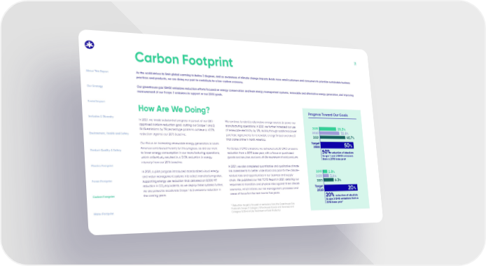 18 How Are We Doing? In 2021, we made substantial progress in pursuit of our SBTi- approved carbon reduction goal, cutting our Scope 1 and 2 GHG emissions by 7.9 percentage points to achieve a 40.7% reduction against our 2015 baseline. Our focus on increasing renewable energy generation in North America contributed heavily to this progress, as did our work to lower energy consumption in our manufacturing operations, which collectively resulted in a 12.3% reduction in energy intensity from our 2015 baseline. In 2021, a pilot program introduced standardized visual energy and water management systems into select manufacturing sites, supporting energy use reduction that delivered an 8,000 MT reduction in CO2 equivalents. As we deploy these systems further, we are poised to accelerate Scope 1 & 2 emissions reduction in the coming years. Carbon Footprint As the world strives to limit global warming to below 2 degrees, and as awareness of climate change impacts leads more retail customers and consumers to prioritize sustainable business practices and products, we are doing our part to contribute to a low-carbon economy. Our greenhouse gas (GHG) emissions reduction efforts focused on energy conservation and lean energy management systems, renewable and alternative energy generation, and improving measurement of our Scope 3 emissions in support or our 2030 goals. We continue to identify alternative energy sources to power our manufacturing operations. In 2021, we further increased our use of renewable electricity by 12%, mainly through additional power purchase agreements for renewable energy (virtual and direct) that came online in North America. For Scope 3 GHG emissions, we achieved a 6.3% GHG emissions reduction from a 2015 base year, with a focus on purchased goods and services and end-of-life treatment of sold products. In 2021, we also completed quantitative and qualitative climate risk assessments to better understand and plan for the climate- related risks and opportunities in our business and supply chain. We published our first TCFD Report in 2021, detailing our responses to transition and physical risks against three climate scenarios, which informs our risk management processes and areas of focus for the next two to five years. * Reduction target is focused on emissions from the Greenhouse Gas Protocol's Scope 3 Category 1 (Purchased Goods and Services) and Category 12 (End of Life Treatment of Sold Products). Progress Toward Our Goals 20% reduction of absolute Scope 3 GHG emissions from a 2015 base year* Target 2030 2019 2020 2021 3.4 % 2.8 % 6.3 % 50% reduction of absolute Scope 1 and 2 GHG emissions from a 2015 base year Target 2030 2019 2020 2021 32.8 % 28.3 % 40.7 % 50 % 20 % About This Report Social Impact Our Strategy Inclusion & Diversity Environment, Health and Safety Product Quality & Safety Plastics Footprint Forest Footprint Carbon Footprint Water Footprint