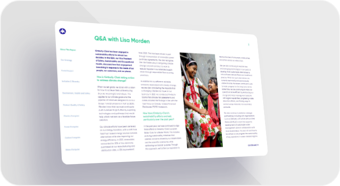 5 Q&A with Lisa Morden Kimberly-Clark has been engaged in sustainability efforts for almost two decades. In this Q&A, our Vice President of Safety, Sustainability and Occupational Health, discusses how that engagement is evolving in response to the needs of our people, our customers, and our planet. How is Kimberly-Clark taking action to address climate change? When we set goals, we do so with a vision for how to achieve them while ensuring they are meaningful and robust. This applies to our climate goals and the pipeline of initiatives designed to cut our Scope 1 and 2 emissions in half by 2030. We also know that we must continue to push ourselves to go further by exploring technologies and pathways that would help unlock net zero as a feasible future ambition. Our climate efforts have been centered on our energy transition, with a shift from fossil fuel-based energy sources towards alternatives while also improving our energy efficiency. In 2021, renewables accounted for 30% of the electricity purchased at our manufacturing and distribution sites, a 12% improvement from 2020. This has been driven in part through incorporation of renewable power purchase agreements. We also recognize the role forests play in mitigating climate change and will continue to work to reduce impacts in our extended supply chain through responsible fiber sourcing practices. In addition to our efforts to minimize emissions associated with climate change, we are also considering the impacts that a changing climate can have on our business. In 2021, we conducted Kimberly- Clark’s first climate risk assessment and communicated the findings in line with the Task Force on Climate-related Financial Disclosures (TCFD) framework. How have Kimberly-Clark’s sustainability efforts evolved, particularly over the past year? In the past year, we have continued to align these efforts to Kimberly-Clark’s purpose: Better Care for a Better World. This includes pursuing sustainability initiatives that address concerns shared by our stakeholders and the scientific community, while reinforcing our brands’ purpose. Through this approach, we further our aspiration to improve the lives of consumers, communities, and others across our value chain. We are also continuing to explore new and emerging technologies in our quest to develop more sustainable alternatives to natural forest-derived fibers and traditional plastics. While few such alternatives are currently technically and economically viable at scale, the teams continue to work to make progress for the long term. At the same time, we are continuing to make our operations more efficient by enhancing our energy and water management systems with digital capabilities, progressing waste reduction efforts, and finding ways to convert scrap materials into secondary products. We also continue to advance strategic partnerships, including with organizations such as Deltares, with whom we launched WaterLOUPE 2.0, a tool that supports development of sustainable water management plans in collaboration with local stakeholders. This tool will continue to be refined as we progress the sustainability of key operations in water-stressed regions. continued → About This Report Social Impact Our Strategy Inclusion & Diversity Environment, Health and Safety Product Quality & Safety Plastics Footprint Forest Footprint Carbon Footprint Water Footprint