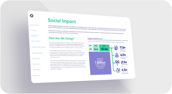 8 How Are We Doing? We continue to make important strides implementing our social impact strategy. As our brands’ programs continue to increase access to essentials like water, sanitation, and hygiene while also helping to break down barriers for women, we are laying the groundwork for accelerating our impact in the years to come. In 2021, Kimberly-Clark advanced the well-being of 15.7 million people in vulnerable and underserved communities, raising our total to 41.4 million people since 2015. While our progress represents an acceleration toward our goal, we recognize that building an impactful program for the scale of our ambition requires further work. Our brands have expanded partnerships to improve quality of neonatal care, and provide educational materials, and financial resources for non-profits providing clean water, sanitation, and hygiene resources in vulnerable communities. We're also exploring ways to reach underserved consumers facing social stigmas, inadequate distribution, or other challenges that hinder their access to essential products for a better life. Since 2015, we’ve advanced the well-being of people by pursuing four strategic priority areas: Progress Toward Our Goal 11.5 M empowering women & girls 41.4 M 25.7 M 17 M 4.0 M COVID-19 and other programs 4.0 M improving access to sanitation 21.9 M helping children thrive 2021 2020 2019 Advance the well-being of 1 Billion people in vulnerable and underserved communities Social Impact The UN Sustainable Development Goals (SDGs) were adopted by the United Nations in 2015 as a rally to end poverty, protect the planet and further peace and prosperity. Recent research shows that progress must be accelerated in several areas including good health and well-being (SDG 3), gender equality (SDG 5), clean water and sanitation (SDG 6) if these goals are to be achieved by 2030. Our ambition is to advance the well-being of 1 billion people through innovation and programs that deliver essentials to vulnerable and underserved communities, helping children thrive, empowering women and girls, and improving access to sanitation. About This Report Social Impact Our Strategy Inclusion & Diversity Environment, Health and Safety Product Quality & Safety Plastics Footprint Forest Footprint Carbon Footprint Water Footprint