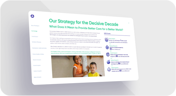 7 Our purpose of Better Care for a Better World is our call to action, challenging us to help billions of people through greater access to life’s daily essentials while building on our past successes, scaling our use of efficient new technologies, and delivering solutions that address the challenges facing our planet in the decade ahead. For Kimberly-Clark, tackling our sustainability risks and opportunities means innovating across our business to evolve our products, solutions, and ways of working. We strive for social impact that helps address inequities in access to education, hygiene, and sanitation, while working to reduce our impact on the planet associated with single-use plastics, forest reliance, carbon emissions, and water use. We will remain steadfast in our efforts to reach our goals because we believe it’s the best way to care for the people we serve, it’s the right thing to do for our planet, and it helps us deliver on our purpose. At Kimberly-Clark, we’re committed to making lives better while working to safeguard the earth’s natural systems. We have established an ambitious set of sustainability goals to guide our efforts. What Does it Mean to Provide Better Care for a Better World? Our Strategy for the Decisive Decade 2030 Goals: Social Impact Advance the well-being of 1 billion people in vulnerable and underserved communities Plastics Footprint Reduce our plastics footprint by 50 % over a 2019 base year Forest Footprint Reduce our Natural (Northern) Forest Fiber footprint by 50 % over a 2011 base year (by 2025) Carbon footprint Reduce our absolute GHG emissions (Scope 1 and Scope 2), by 50 % over a 2015 base year Water footprint Reduce the water footprint of our mills in water stressed areas by 50 % over a 2015 base year About This Report Social Impact Our Strategy Inclusion & Diversity Environment, Health and Safety Product Quality & Safety Plastics Footprint Forest Footprint Carbon Footprint Water Footprint