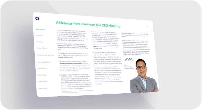 4 A Message from Chairman and CEO Mike Hsu As I reflect on the last year, I’m proud of how our team at Kimberly-Clark remained committed to caring for our consumers, customers and communities in the face of significant global challenges. These events have taken a toll on society and on our planet, reinforcing the need to be better stewards for current and future generations. At Kimberly-Clark, that means fulfilling our purpose of Better Care for a Better World through the products we make, the workplaces we create and the communities we serve. Our 2030 sustainability goals are critical to our purpose, and our sights are set on achieving them. Here are some progress highlights for 2021: • Our brands continued to deliver toward our goal to improve the well-being of 1 billion people by 2030 by increasing people’s access to clean water, safe sanitation and hygiene through programs like “Toilets Change Lives” and partnerships with NGOs, including Water For People, WaterAid and Plan International. • Consistent with the world’s enhanced climate action commitments coming out of COP26, we made progress against ambitious targets approved by the Science Based Targets initiative (SBTi) for reducing our Scope 1 and 2 greenhouse gas emissions by 50% and our Scope 3 emissions by 20%* – all by 2030. As of the end of 2021, we achieved nearly a 41% reduction in operational emissions (Scope 1 and 2) versus our 2015 base year. • In addition to reducing our operational footprint, we’re continuing to develop more sustainable solutions for our global portfolio, including alternative fibers and plastics. In 2021, 87% of the fiber we used globally came from environmentally preferred sources. On the plastics front, we’ve doubled the percentage of our recycled content in our plastics packaging, and, through our various partnerships, we’re exploring more sustainable, commercially viable and scalable alternatives to fossil fuel-based plastics. • We continued to foster a culture of inclusion that recognizes, values and celebrates the diverse perspectives of our team. Among other pillars of our strategy, we’re focused on leveraging leadership to drive inclusion and diversity with initiatives including educating team leaders through our Activating Inclusive Leadership Lab to build high-performing, inclusive and diverse teams. • As we continued to navigate the global COVID-19 pandemic, we prioritized the health and safety of our people with global protocols that often exceeded local requirements. A number of our sites provided preventive programs, including free on-site testing, vaccination clinics for employees and family members as well as training and education. Supporting our people’s health and safety enabled us to continue producing the essential products that people around the world depend on every day. * Scope 3 reduction target focuses on purchased goods and services and end of life treatment of sold products. I’m proud of what the team has accomplished and recognize there’s more we need to do to meet the challenges of the moment. As Kimberly-Clark continues to grow our business, our care for consumers, customers, partners, communities, and our people, remains front and center. From our commitment to climate stewardship and our efforts to develop more sustainable solutions for our product portfolio to our focus on inclusion and diversity and our ambition to advance the well-being of 1 billion people around the world, we’ll continue to drive positive impact as we create long-term value for our shareholders. That’s how we deliver Better Care for a Better World. Mike Hsu Chairman, CEO, and Proud Employee About This Report Social Impact Our Strategy Inclusion & Diversity Environment, Health and Safety Product Quality & Safety Plastics Footprint Forest Footprint Carbon Footprint Water Footprint