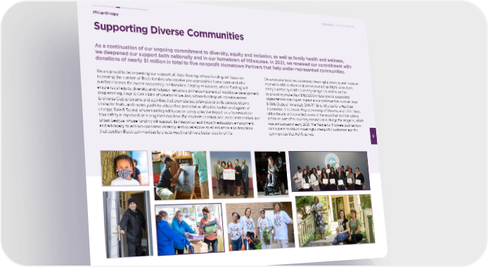 Supporting Diverse Communities Philanthropy 53 2021 ESG REPORT As a continuation of our ongoing commitment to diversity, equity and inclusion, as well as family health and wellness, we deepened our support both nationally and in our hometown of Milwaukee. In 2021, we renewed our commitment with donations of nearly $1 million in total to five nonprofit Hometown Partners that help under-represented communities. We are proud to be expanding our support of: Acts Housing, whose funding will focus on increasing the number of Black families who receive pre-approval for home loans and who purchase homes for owner-occupancy in Milwaukee; Employ Milwaukee, whose funding will ensure racial equity, diversity, and inclusion remains a prime component of workforce development programming; Boys & Girls Clubs of Greater Milwaukee, whose funding will increase access to diverse Club programs and activities that promote social/emotional skills, develop strong character traits, and inspire youth to unlock their potential as efiective leaders and agents of change; Safe & Sound, whose funding will focus on using collective impact as a framework for how safety is improved on a neighborhood level for residents in Milwaukee; and Greater Milwaukee Urban League, whose funding will support its mission to lead through education, employment and advocacy to achieve economic vibrancy and equal access to all industries and disciplines that position Black communities to create wealth and live a better quality of life. On a national level, we celebrated meaningful diversity and inclusion moments with in-store and online product spotlight collections, many curated by Kohl’s Diversity Design Council as well as by providing more than $700,000 in total grants supporting organizations making an impact in our communities, such as Boys & Girls Clubs of America’s SMART Girls, Alliance for a Healthier Generation, The Trevor Project, Runway of Dreams, and USO. These philanthropic efiorts reffect some of the ways that Kohl’s is taking action as part of its diversity and inclusion Pledge for Progress, which was announced in early 2021. The Pledge for Progress outlines how Kohl’s plans to deliver meaningful change for customers and the communities that Kohl’s serves.