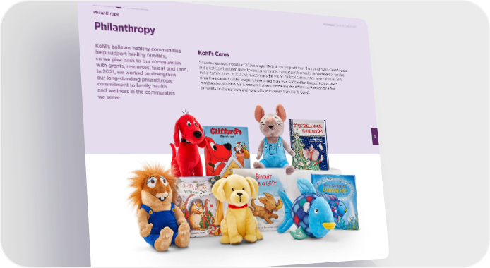 Kohl’s believes healthy communities help support healthy families, so we give back to our communities with grants, resources, talent and time. In 2021, we worked to strengthen our long-standing philanthropic commitment to family health and wellness in the communities we serve. Philanthropy 49 2021 ESG REPORT Kohl’s Cares Since its inception more than 20 years ago, 100% of the net profit from the sale of Kohl’s Cares® books and plush toys has been given to various nonprofits that support the health and wellness of families in our communities. In 2021, we raised nearly $16 million for local communities across the U.S. and, since the inception of the program, have raised more than $400 million through Kohl’s Cares® merchandise. We have our customers to thank for making this difference. Read on for a few highlights on the partners and nonprofits who benefit from Kohl’s Cares®. Philanthropy