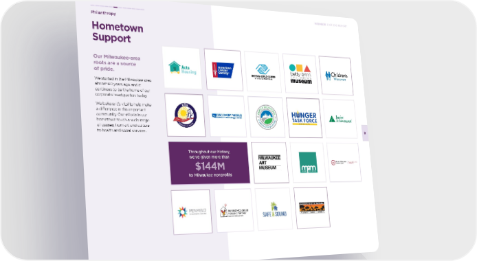 Hometown Support Philanthropy 2021 ESG REPORT Our Milwaukee-area roots are a source of pride. We started in the Milwaukee-area almost 60 years ago and it continues to be the home of our corporate headquarters today. We believe it’s vital to help make a difference in this important community. Our efforts in our hometown touch a wide range of causes, from art and culture to health and social services. Throughout our history, we’ve given more than $144M to Milwaukee nonprofits 52